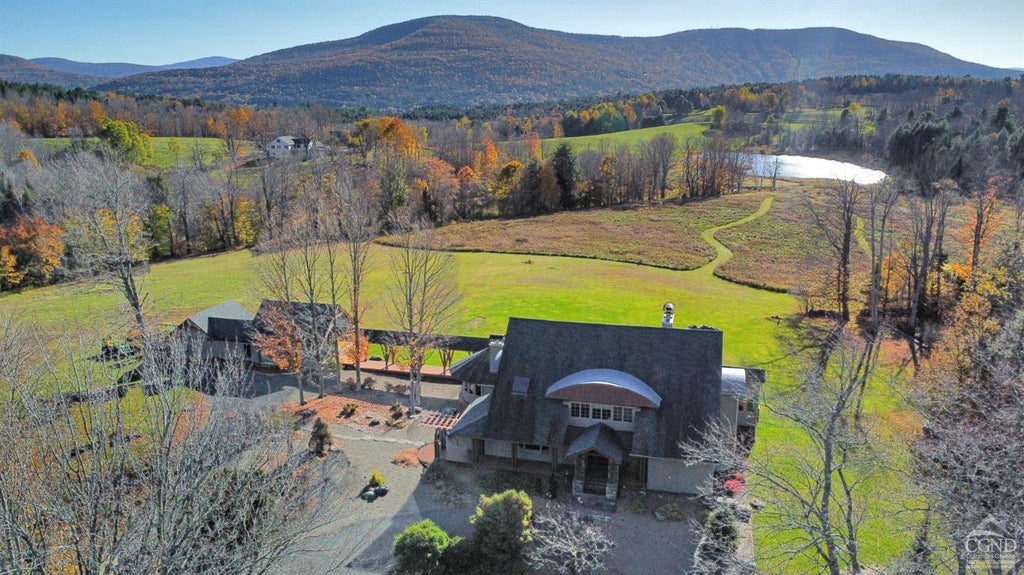 Designed by a renowned Manhattan architect known for $20M Aspen ski homes, this 4,834-square-foot Catskills estate offers world-class design and unparalleled craftsmanship. Built as the architect's personal residence, it's a sanctuary for relaxation, entertaining, and year-round mountain living. Set on over four private acres bordering the protected Bataviakill Watershed, the home seamlessly integrates stunning Windham Mountain views with vaulted ceilings, floor-to-ceiling windows, and tiered decks. The property boasts five spacious bedrooms, three full baths, and a half bath, all thoughtfully designed to balance comfort and effortless entertaining. The sunken great room is a centerpiece, featuring a dramatic floor-to-ceiling wall of glass framing breathtaking mountain views. A striking stone fireplace adds warmth, while the formal dining area and chef's kitchen complete with custom cabinetry and stainless-steel appliances offer an ideal space for hosting. Additional highlights include a cherry-paneled office with bespoke built-ins, a glass-enclosed gym with panoramic views, and an indoor sauna for post-workout relaxation. The standout four-season circular porch, lined with windows and equipped with a wood stove, ensures uninterrupted connection to nature, making it the most enchanting space in the home. The first floor includes a guest suite, while the second floor features a private primary ensuite wing with a balcony overlooking Windham's slopes. The finished basement offers a family room and billiards lounge. Radiant in-floor heating, custom built-ins, cedar closets, and split-unit air conditioning enhance comfort and luxury. Outdoors, tiered decks, patios, lush landscaping, and a manicured yard create a serene setting, while a covered path leads to a three-bay garage perfect for vehicles and recreational gear. Tucked off a private road, this home offers true seclusion while being just minutes from Windham's town center and Windham Mountain activities. Combining stunning views, luxurious custom finishes, and unmatched craftsmanship, this estate stands apart from today's new constructions. Schedule a private viewing and experience mountain living redefined. Your perfect oasis awaits!