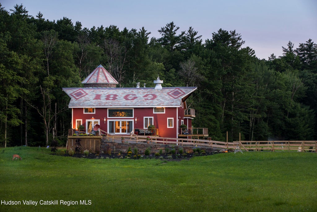 Buckle up! 5 Downer Lane may be the most interesting property you see all year! This 19th century hand-hewn barn-to-house conversion has 35 foot ceilings, tons of sunlight and bespoke stain glass throughout. The layout is wide open to your own creativity and all the possibilities you can conjure up. Permitted as a successful year 'round Airbnb and currently configured with four bedrooms (two in the turret!) and two additional sleeping areas, it has FIVE designer bathrooms, a grand living/ dining space - with a fireplace and the chandelier of your dreams. This magical abode should not be missed, if fun and FABULOUS are what you are looking for! With bluestone kitchen, including Eisenhower pink retro-style appliances by Big Chill, and a screening room for 20 people, this home at more than 3100 square feet, offers plenty of space to dream! A cabana with 2nd kitchen opens onto a huge circular deck - over 3000 sq ft - with complete southern exposure. It completely surrounds the heated pool and hot tub with a view of the mountains and plenty of sky. The 5.85 acres offers up additional amenities, such as a dry sauna, custom-built tiny house, and a separate gym complete with electricity and matted floors. Dream BIG and make this classic Woodstock retreat all yours. A PERFECT reason to call the Hudson Valley, HOME.
