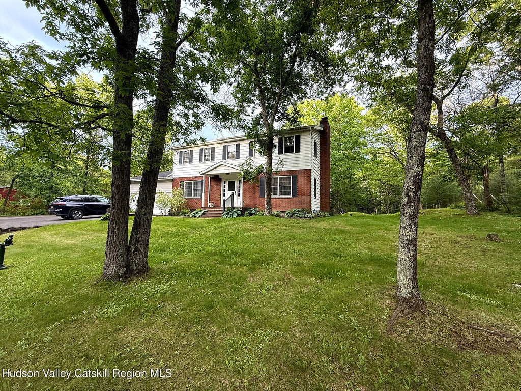 Spacious Colonial private setting on country road. Large kitchen, LR with masonary FP , Dining room and dinette . long open family room, 4 spacious BRs, den with woodstove and access to rear deck. Full basement, two car garage, hardwood flring in BRS,LR,DR, den / vu=inyl in laundry, kit, tile in baths and FR, slate flooring in foyer