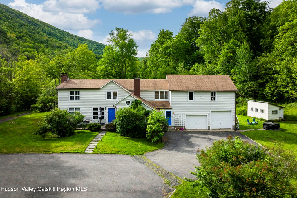 Tucked away on 10 private, wooded acres in the heart of the Catskills, this unique compound offers the perfect blend of rustic charm, modern comfort, and income-generating potential. With a 4-bedroom, 2.5-bath main house and a separate 2-bedroom, 1-bath guest house, this serene escape is ideal for full-time living, weekend getaways, or as a turnkey investment property. The grounds feature a pool, hot tub, fire pit area, and a large barn—perfect for storage or ready to be transformed into a pool house, studio, workshop, or additional outbuilding. This is a rare opportunity to own a beautifully appointed home that truly has it all—privacy, space, and amenities. The main house welcomes you with warm hardwood floors, abundant natural light, and classic details throughout. A wood-burning fireplace anchors the formal dining room, setting the tone for cozy evenings and stylish entertaining. Upstairs, four spacious bedrooms offer serene views of the surrounding woods and mountains. The separate guest house provides ultimate flexibility—perfect for visitors, a home office, or added rental income. Outside, enjoy summers by the in-ground pool, stargazing from the hot tub, or unwinding around the fire pit. Two additional outbuildings and mature landscaping complete the grounds, offering even more potential for gardening, recreation, or creative use. Just minutes to Belleayre Mountain for skiing and hiking, and a short drive to the beloved towns of Phoenicia, Woodstock, Margaretville, and Big Indian for restaurants, shops, and live music. Whether you're hitting the trails, floating down the Esopus Creek, or exploring nearby farm markets and galleries, you're surrounded by the best of the Catskills. All this just about 2.5 hours from NYC—making it as convenient as it is enchanting.