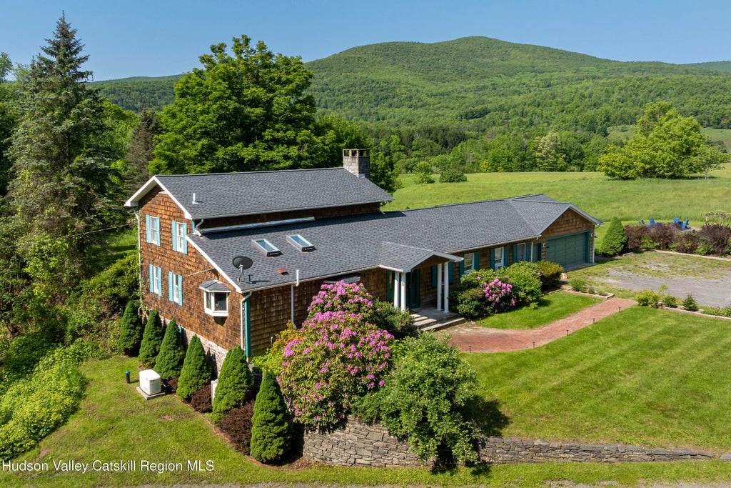 Step into the charm and character of this one-of-a-kind historic home built in 1754, nestled atop a hill with panoramic views. With 4 bedrooms, 2 full bathrooms, breathtaking scenic mountain views, inground swimming pool, hot tub, and large barn sitting on over 5 acres of land, this property invites you to embrace the serenity of Catskills living. Whether you're seeking a weekend retreat or a full-time residence, this home has it all. You'll first be greeted by a proper entryway and gallery hallway, which leads to a kitchen designed for effortless entertaining. The kitchen flows seamlessly into the formal dining room, where a modern chandelier casts a warm glow over intimate dinners and festive gatherings alike. The inviting living room has a natural stone fireplace creates a cozy ambiance on chilly evenings. Built-in bookshelves and custom woodwork add a touch of refined elegance. A showstopping curved staircase winds its way to the second floor, adding a touch of architectural drama. This home's unique blend of eclectic design elements creates a chic ambiance with vibrant pops of color and playful accents adding a touch of whimsy to every room. Anyone who needs or wants to work from home here can use one of the three downstairs guest bedrooms as a comfortable and productive home office. The second floor features a luxurious primary suite, a private retreat to unwind and recharge. An additional living space provides a cozy spot to have a fun game night or enjoy a movie. The ensuite bathroom with its high-end fixtures and finishes create a serene and indulgent atmosphere. The property also includes a spacious 2-car garage and a rustic barn which offers extra storage or a workshop space. The outdoor space here is truly exceptional. A magnificent inground pool, with the breathtaking mountain view as its backdrop, is the centerpiece of this outdoor oasis. The enclosed backyard area offers a variety of amenities for relaxation and entertainment, including a soothing hot tub, a pergola and grill area perfect for hosting gatherings, and ample seating and lounging space for you and your guests to enjoy. With over 5 acres of outdoor space at your disposal, the possibilities are endless. Located in picturesque Prattsville, you're minutes from all the best the Catskills have to offer: hiking trails, charming small towns, and local dining. Hunter Mountain and Windham are just a short drive away for skiing and year-round adventure, or Tannersville for shopping and dining. This historic gem offers the perfect blend of privacy, charming beauty, and convenience. The house can come furnished (with a few exclusions) so you can move right in and start to enjoy. Don't miss your chance to own a slice of Catskills serenity—schedule your showing today and let this house welcome you home.