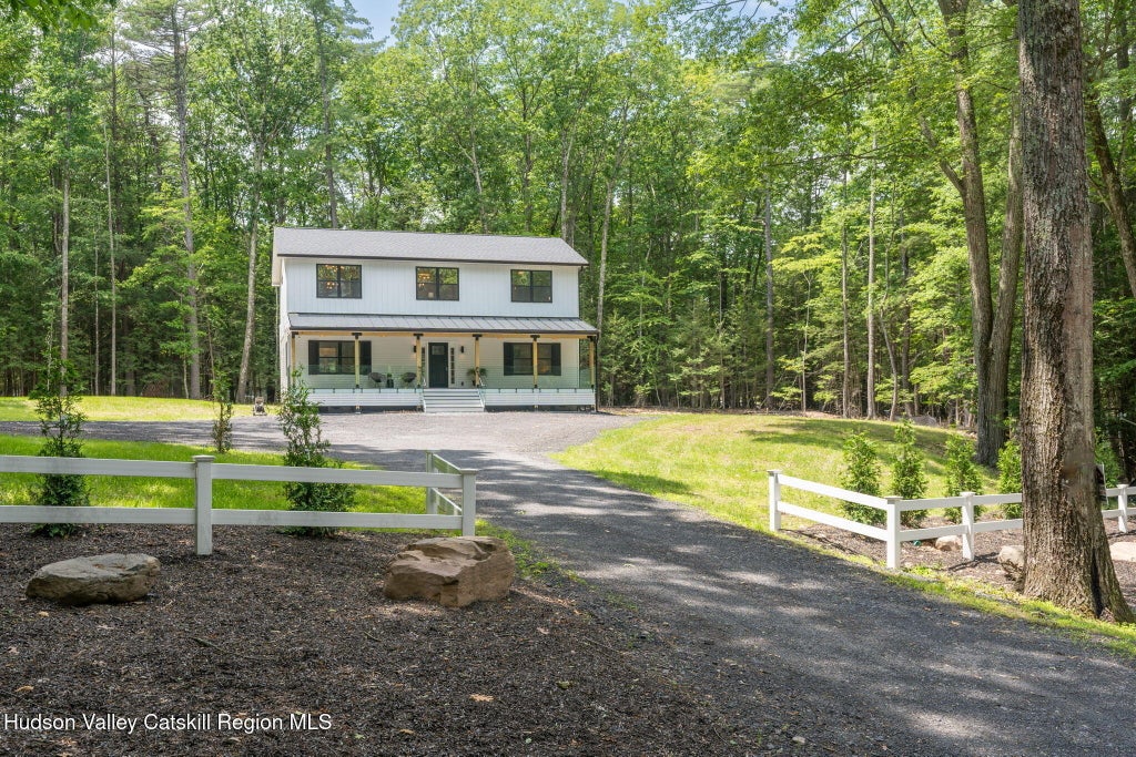 Blending classic country charm with modern sophistication, this newly built modern farmhouse offers over 3,000 square feet of beautifully finished living space. Designed with clean lines, a neutral palette, and layered textures, it delivers a timeless aesthetic full of warmth and character. The home features four spacious bedrooms, three and a half baths, a fully finished lower level, and multiple flex spaces throughout. From the moment you arrive, the inviting covered front porch sets the tone—perfect for gathering or relaxing—with sleek modern glass railings offering a fresh take on traditional farmhouse style. Inside, the open-concept main level is filled with natural light, thanks to large windows and a sliding glass door that seamlessly connect indoor and outdoor living. The living and dining areas flow effortlessly into the eat-in kitchen, where a quartz waterfall island, stainless steel appliances, and a farmhouse apron sink create a space that's both functional and stylish. Just off the kitchen is a powder room and a versatile flex room. Anchoring the home is a dramatic glass-railed staircase that adds a bold architectural statement. Upstairs, two luxurious bedroom suites anchor each end of the second floor, complete with elegant baths and generous closets. A cozy reading nook and two additional guest bedrooms—bright and welcoming—share a full hallway bath for easy access. The finished lower level adds another 1,000 square feet of flexible living space—ideal for a game room, home gym, theater, yoga studio, or office. It also includes a laundry area, utility room with a new high-efficiency boiler, and ample storage. Ideally located just minutes from the heart of Woodstock, with easy access to Hunter and Belleayre ski resorts, this home is perfectly positioned for all-season living. Enjoy proximity to local shops, restaurants, farmers markets, hiking, biking, and the vibrant communities of Kingston, Saugerties, Phoenicia, and beyond. This modern farmhouse is the perfect retreat for leisure, adventure, and everyday living.