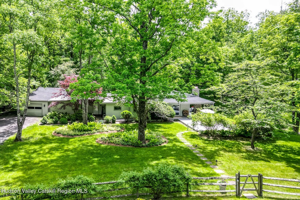 35 Abbey Road — A Mid-Century Sanctuary minutes from Woodstock Town Tucked away off of Abbey Rd and just a short pass over a charming stream you'll arrive at this pristine, authentic mid-century retreat, nestled in the heart of Woodstock's beloved Abbey Road. Set on 5.4 magical acres, this serene property captures the essence of Catskills living- graceful, grounded, and surrounded by nature's finest. As you arrive, you're embraced by lush perennial gardens, flowering trees, and native hardwoods that invite a symphony of birdsong and butterflies. Babbling brooks meander along the property's edge, and an underground electric fence spanning over two acres ensures your pets can roam freely and safely. Sunrise and sunset are spectacular here—best enjoyed from the expansive deck, the gardens, the meadow, or the sparkling 20' x 40' heated saline pool, a radiant focal point reflecting sweeping mountain views. Whether hosting guests or unwinding in solitude, this home is an effortless haven. Inside, soaring 18-foot ceilings and walls of glass flood the loft-style interior with natural light and invite the landscape in. Anchoring the main living space is a dramatic floor-to-ceiling stone wood-burning fireplace, exuding warmth and timeless charm. The gourmet kitchen is a chef's dream, appointed with a hooded six-burner Wolf range, stainless steel dishwasher, a French door refrigerator providing ample storage, polished granite countertops, and a generous walk-in pantry. A spacious media/family room offers privacy and tranquility, set apart from the main living area with sliding doors and peaceful views of the stream. Oversized closets and thoughtful storage solutions abound throughout the home, including the attached, heated garage with custom built-ins and a dedicated storage attic. Down a wide, skylit gallery, you'll find the bedroom wing, including a luxurious primary suite—a true retreat, large enough to accommodate a sitting area, complete with double walk-in closets and a spa-like bathroom flooded with natural light and outfitted with radiant heated floors. A second bathroom features a shower/tub combo. There are hardwood floors throughout the home. These wood floors continue beneath the carpeted rooms. The house has been updated with a new heat pump system offering energy efficiency. Outdoors, Trex decking provides a comfortable transition to the pool, gardens, and lawn, with thoughtful night lighting illuminating the paths, up-lit trees, and landscaping for evening enjoyment. A poolside cabana with electric and water connections adds both convenience and charm. A fenced vegetable and cutting garden provides fresh bounty through the seasons. Bordering forever-wild state land and flanked by ancient stone walls, the property offers private hiking trails for adventurous souls. For those who prefer maintained paths, Wilson State Park is just a mile away, with year-round recreation, a freshwater lake, and boat rentals. You're a mere seven minutes from the iconic villages of Woodstock and Phoenicia, and only 30 minutes to ski resorts—though once here, you may never want to leave. This is not just a home—it's paradise, found.