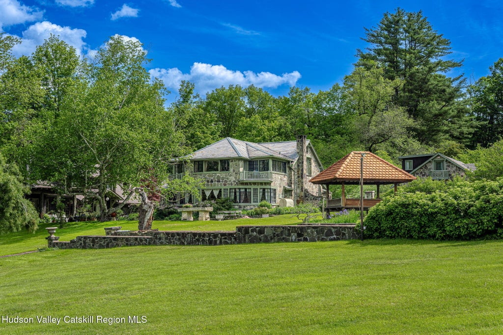 Welcome to Happy Brooks , The much-loved compound for many years of Woodstock Festival co-founder and legendary music industry icon Michael Lang, this mythic Mt. Tremper property boasts true style, along with a creative pedigree that dates back to the 1920s. Originally built for the artist G. Adolph Anderson, the 17 acre estate features three architecturally significant & historic structures designed by prominent architect A.M. Bedell; the original main house was built in 1928, with the two additional & alluring buildings following soon after. The grandly scaled double-height great room of the primary residence has played host to renowned artists of every stripe through the decades, with the inspired design detail easily matched by the world-class art and music created within its impressive walls. In this wing you will also find an office, two powder rooms, upper-level bedroom, and a library. Past a massive bluestone fireplace on the ground floor a central foyer leads into a formal dining room with long-range mountain views, a cooks'' kitchen with breakfast area, and an open-plan media room (and another massive fireplace with wood stove & built-in bread oven). A light-filled hallway brings you to three oversized bedroom suites, including the romantic, beautifully scaled primary. Behind magnificent stained glass doors you will find a reading room with window seats that overlook the verdant, rolling lawn below. Connecting this wing of the home is a spectacular conservatory with a 24-foot glass ceiling - the perfect place to cultivate plants (or plans), paint a masterpiece, or simply dream. Across the central courtyard, and framed by a wide, mature birch tree is a two bedroom storybook guesthouse that holds true design treasure. An oversized living room leads into a den with bluestone fireplace and a striking collection of built-in Fu dogs and wood-carvings on gilded plaques collected from travels to China that depict an epic story (like the one you can create here). There is also a charming dining area and full kitchen. The third stone and wood structure is a two bedroom cottage that is connected to a three-bay garage, and has a greenhouse ready to be restored or turned into a Romanesque walled garden. Additional structures include a tool shed, three-stall barn, as well as an enchanting picnic pavilion sited up on a knoll with views of Slide Mountain, the tallest peak of the Catskills. From the moment you enter the gates there is a feeling of being in your own private village, and the park-like land is a natural wonder, with winding paths, stone walls, orchards, fields of wildflowers and a large centerpiece pond with its own art island showcasing a sculpture by Michael Lang. On sultry summer days you can enjoy a swim in the 53 x 40 oval lined cement pool while gazing at the peaks and valleys in the distance. Mt.Tremper is located just minutes from main street Woodstock, and Happy Brooks itself is approximately two hours from NYC. This rare Hudson Valley treasure, so full of possibilities, is ready for its next refresh and adventurous steward. So come on and get Happy