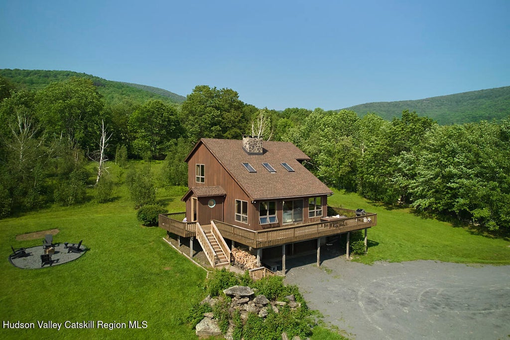 This super private retreat offers clean architectural lines, abundant natural light, and over 14 private acres. The home is centered around the sun-soaked open-concept living and dining area, where soaring cathedral ceilings and large windows bring the outdoors in. Take in breathtaking mountain views (including the slopes at Belleayre), cozy up by the new wood stove, and enjoy the warmth and style of this thoughtfully updated home. The adjoining kitchen has been tastefully renovated with brand-new appliances, tiled flooring, and sleek countertops, making it a joy to cook and entertain. Also on the main floor, you'll find a spacious bedroom and a beautifully remodeled full bath with contemporary finishes. Upstairs features two more generously sized bedrooms—each with great light and stunning views—as well as a second, fully updated bathroom. A charming loft space offers the perfect nook for a home office or reading nook. Not included in the square footage is the two-car garage and unfinished basement downstairs with great potential for additional living space or practical storage. Outside your wraparound deck is perfect for dining al fresco or watching the sun set. Explore the many wooded acres, gather around the fire pit, or start a garden or orchard — this property has endless possibilities. All this privacy and space are just 15 minutes from the charming town of Fleischmanns and skiing at Belleayre Mountain.