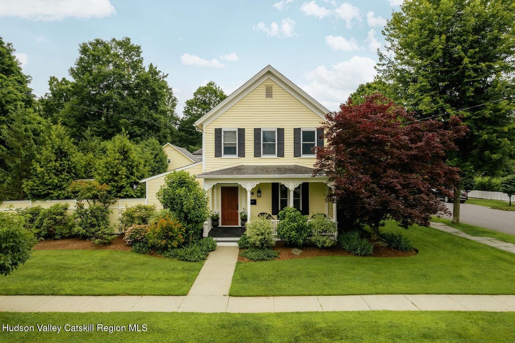 Welcome to the Buttercup House, a quintessential Rhinebeck Village home, at 38 Chestnut Street in the heart of Rhinebeck Village's Historic District. A generous corner lot in an exceptional location, this home is a classic Folk Victorian Farmhouse, with a full length covered front porch, lush perennial landscaping, and a spectacular private back yard. Featured in ''HGTV Magazine,'' this home has been meticulously renovated, restored, and updated for a contemporary lifestyle while maintaining the charm and architectural details that honor its history. Stepping into this home and through the front foyer, the main floor has a warmly inviting living room, a formal dining room with a bay window and window seat, and a modern yet classic kitchen with a Wolf induction range and Bosch appliances, which leads to a rear mudroom and rear entry. A front to back hallway also connects a main floor half bath, laundry room, and private den which leads to a side yard pergola-covered bluestone patio with stone wall. Upstairs, two bedrooms share a hallway bath while the primary suite offers a bedroom with a bay window, dressing room, walk-in closet, and ensuite bath. Outside, the fully fenced back yard offers a private and gorgeously landscaped retreat with an additional bluestone patio plus a path that leads from the back of the home to a driveway and Carriage House. The Carriage House features spaces for 2 cars and storage on the first level plus 600 square feet of additional space on the second level. Easy walking distance to all of the amenities that Rhinebeck has to offer, and 5 minutes to the Amtrak station in Rhinecliff.
