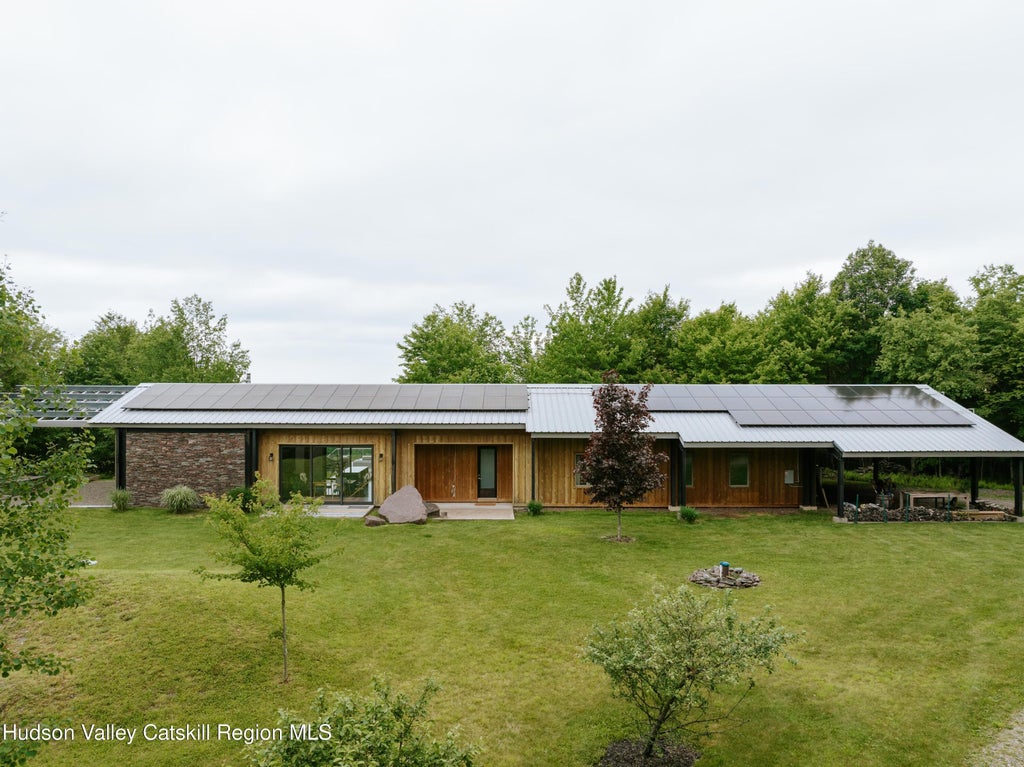 Perched on nearly 12 private mountaintop acres, 1199 W. Highland Road isn't just a home—it's a front-row seat to one of the Catskills' most breathtaking views. From the moment you wind your way up the scenic drive, glimpses of the mountains build anticipation until you reach the main entrance, where soaring windows frame an awe-inspiring panorama. Inside, a whimsical rock-climbing wall entryway sets the tone for this playfully refined escape designed DHD Architects and Interior Design. In the open-concept great room, 16-foot cathedral ceilings rise above a wall of glass—sliding doors that open, up to 18 feet wide, erasing the boundary between indoors and out. Hand-stacked stone walls—quarried right from the land—carry through to the semi-enclosed outdoor living space, where a massive fire pit and soaring swings create an unforgettable gathering spot. Back inside, a sleek wood-burning stove anchors the lounge area, while a chef's kitchen stuns with SMEG appliances, a breakfast bar, and modern finishes. Hunter Douglas automatic solar shades provide privacy with the press of a button. Step outside to the west-facing deck with panorama views, and soak in a resort-like spa zone: an 8-person cedar sauna to the left, Bullfrog hot tub, and fire pit—all set to a backdrop of endless sunset mountain views. Four generous bedrooms occupy the private wing of the home, including a junior ensuite and a Jack-and-Jill suite with bunk capacity—ideal for hosting with ease. Each bathroom features custom finishes in brushed cement board and corrugated steel, reinforcing the home's subtle industrial undertone. Oversized windows throughout frame the surrounding forest and sky, turning every room into a living work of art. The primary suite is a true retreat with its own private entrance that has covered parking, and EV charger hookups. Inside, the spacious room has a sitting area to enjoy morning coffee, dual walk-in California Closets, and a spa-like modern bath for total indulgence. Nestled just 162 miles north of New York City, Hobart is affectionately known as the ''Book Village of the Catskills'', with a charming Main Street lined with half a dozen independent bookstores. Beyond its literary scene, Hobart's scenic setting offers hiking and biking along the Catskill Scenic Rail Trail, horseback rides at Broken Spoke Stables, and trout fishing in nearby creeks. Make sure to grab breakfast at Stamford Coffee, the pastries are delish! Whether you're dreaming of a stylish full-time residence or a curated weekend retreat, 1199 W. Highland Road invites you to breathe deeply, live fully, and reconnect with nature and yourself.