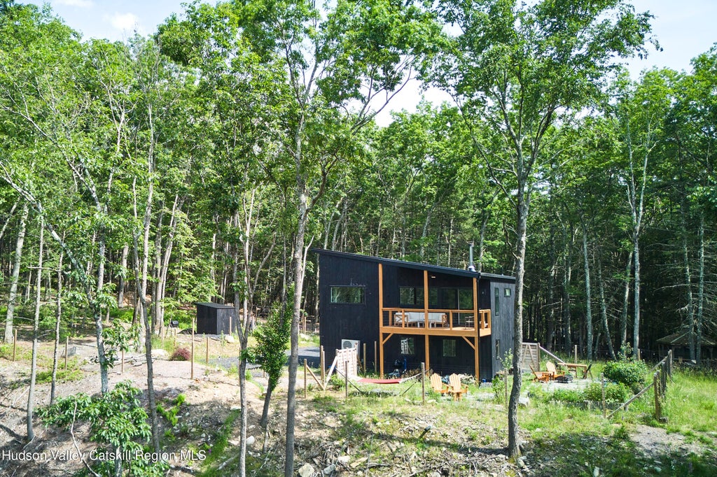 A sleek, modern escape awaits in the beautiful sanctuary of the Black Forest community in Glen Spey, NY. Peacefully situated on a bluff above Mill Brook Creek, this recently-built-lightly-used homestead offers a turnkey retreat with room to grow. The striking black exterior houses a light and bright living space. Entering through the first floor foyer, you'll find a guest bedroom and half bath leading to a large and highly adaptable studio space. Initially designed as a two car garage, and maintaining the functional glass-and-steel garage door, this insulated and heated space has been utilized as a entertainment and creative space. In the warmer months, the garage door opens up to create and ideal indoor/outdoor living room. The main living quarters are upstairs on the second floor, taking advantage of ridgeline views and giving the home a treehouse feel. The open plan living space lends itself nicely to entertaining, with the large chef's kitchen taking center stage. A cozy wood stove anchors the lounge and dining area, and a spacious deck expands the living space outdoors. The primary bedroom features high ceilings and large built in closets, and opens onto a full bathroom with a tiled tub and shower. Conveniently, the bathroom also has an entrance to main living space. Outside, the grounds feature fenced garden areas, including a stone patio perfect for morning coffee and evening cocktails. This home was originally envisioned as the guest house for a larger house on the property, and there is plenty of flat space to accommodate that vision in the future if you so desire. A large gazebo and outdoor tub offer some charming nods to the site's origins as a fishing camp. Speaking of fishing - a lovely hike down through the woods brings you to expansive frontage on Mill Brook, batting above its weight with brown trout as large as two feet (so say the locals). Alternately, you can post up creekside for a dip and some original ASMR. The Black Forest Club is a private community ideal for the outdoor enthusiast, offering 1100 acres of private hiking trails, stunning waterfalls, hidden swimming holes, abundant fishing and waterfront access to the Delaware River. Ten minutes to Eldred or Barryville, NY and thirty minutes to Narrowsburg. All this, and less than two hours to NYC!