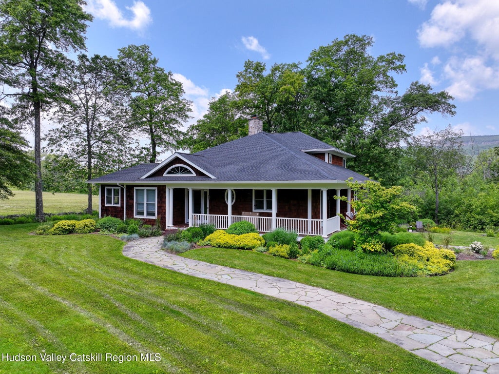 Modern Sophistication Rooted in Timeless Design with Iconic Tower Views on 5 Secluded Acres. Imagine waking each morning to Mohonk's legendary Smiley Tower gracing your western horizon, while golden sunsets create nature's daily canvas that has drawn artists to the Hudson Valley for generations. Your front-row seat to this natural theater sits on five pristine acres where only birdsong and wind through trees break the silence. Tucked away yet minutes from New Paltz's vibrant heart, this masterpiece jewel sits along the storied Testimonial Gatehouse Path of the Mohonk Preserve. Cedar shake siding weathers beautifully against seasons while classic architectural lines define the home's distinctive character—a sanctuary that feels utterly private yet perfectly linked to the Hudson Valley's most coveted landscape. Step through the front door as a wall of glass transforms the great room into a living gallery where mountain vistas change with light throughout the day. Indoor and outdoor living merge seamlessly—from the kitchen's expansive island where friends naturally gather, to the covered front porch where morning coffee tastes better, to the sprawling back porch where Ipe wood feels warm beneath bare feet and every dinner becomes celebration. Wide steps cascade gracefully down to the shaded backyard where a fire pit sits encircled by sleek modern Adirondack chairs, creating perfect gathering spots for evening conversations under stars. The custom Apuzzo kitchen serves as culinary command center with preserved meadow views as backdrop. Every detail whispers thoughtful luxury: new oak floors glowing with radiant warmth, designer lighting creating perfect ambiance, exquisite new interior doors with porcelain knobs that feel like jewelry in your hands. The primary suite's dedicated wing offers personal haven with walk-in closet, spa-like ensuite bath, and versatile office space doubling as home gym. French doors open directly onto the back porch where mountain views work magic during evening wine or morning yoga. Even practical elements elevate to art. The mudroom welcomes with custom cabinetry and built-in storage making everyday life effortless, while the adjacent laundry room captures incredible views and includes dedicated dog washing station. The whole-house triple filtration system with reverse osmosis ensures every drop of water—drinking, showering, washing—stays pure as mountain air outside. Upstairs, two generously proportioned bedrooms and full bath create perfect family or guest spaces, with unfinished area awaiting your vision—perhaps home theater, art studio, or that dreamed-of reading nook. Where the Mohonk Preserve becomes your backyard and the fabled tower stands sentinel over daily life, you'll understand why some places transcend addresses to become destinies waiting to be claimed. Complete bespoke custom renovation within two years: custom Apuzzo kitchen, new oak floors throughout, new interior doors with premium hardware, freshly sealed Ipe decking, brand-new roof protecting house and garage, propane radiant heat with electric backup, zoned AC, automated irrigation system, invisible fence letting pets roam free.