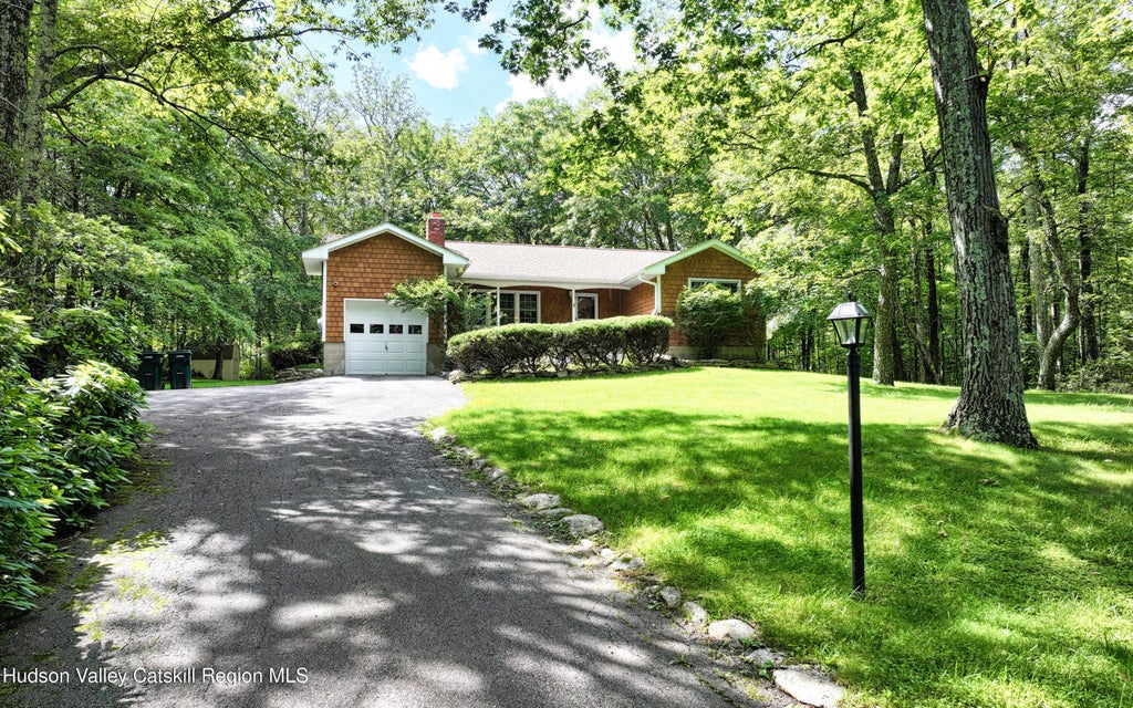 Welcome to this beautifully updated and well maintained 3 bedroom home nestled on 2 private acres in the peaceful Shawangunk mountains. This residence offers a perfect blend of modern comfort and classic charm, featuring a spacious kitchen with sleek quartz countertops, elegant hardwood floors, and recessed lighting throughout. The heart of the home is a living room graced by a beautiful brick fireplace, ideal for cozy gatherings. Enjoy year-round comfort on the expansive covered deck, complete with screens for breezy summer evenings and windows for warmth in the cooler months. Inside, you'll find three inviting bedrooms and a spacious den with built-in shelving, plus a convenient door leading to the one-car garage. Outdoors, a charming gazebo and a storage shed with electricity provide extra space for relaxation and hobbies. The property is private yet conveniently close to town for shopping and dining, as well as nearby wineries, hiking trails, and a variety of outdoor activities. Experience the perfect balance of country living and modern convenience in this exceptional Pine Bush home.