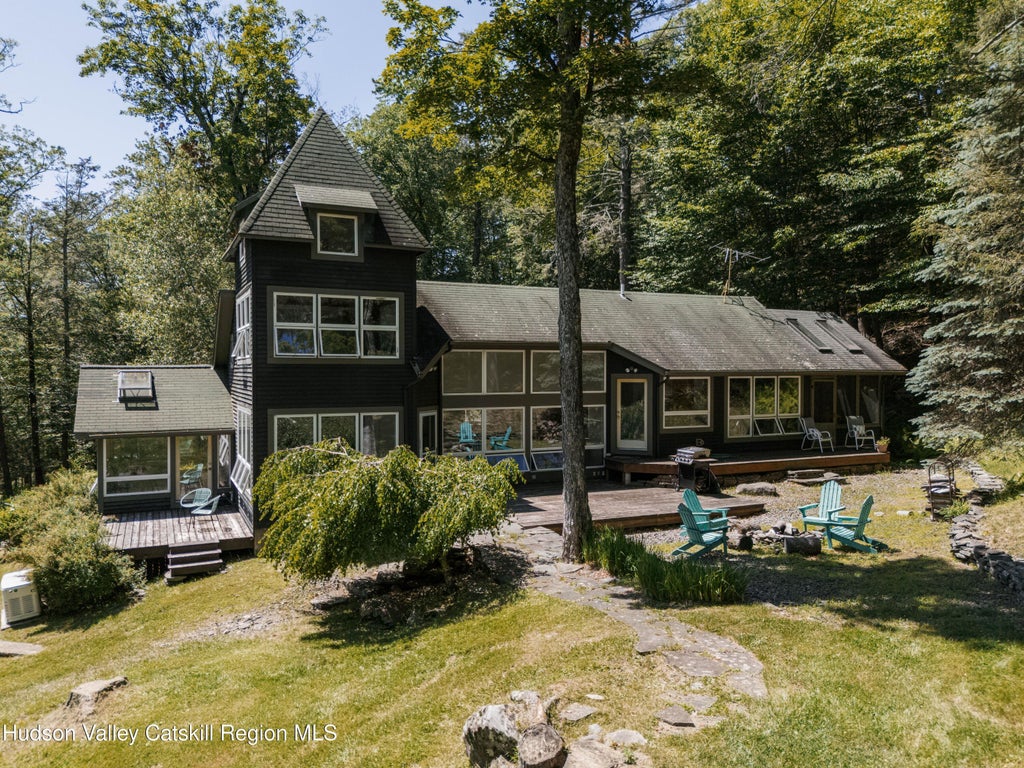 Tucked away on over 7 private acres off a quiet road in coveted Mount Tremper, this striking 2-bedroom, 2.5-bath contemporary offers ultimate seclusion, panoramic mountain views, and the kind of indoor-outdoor living dreams are made of. With soaring windows and a bright open-concept layout, the living room flows effortlessly into the dining area and kitchen, complete with a breakfast bar for casual mornings and late-night conversations. Step into the sunroom—ideal as a home office, cozy den, or easy third bedroom—and enjoy the peaceful connection to nature all around you. The primary suite is a true retreat with radiant floor heat, a luxe en-suite bath with deep soaking tub, walk-in closet, and its own screened-in porch for quiet mornings or starlit evenings. The home also features baseboard oil heat, a brand-new boiler and heating system (2024), new well pump, and a full water filtration system. Outside, a saltwater pool with a brand-new liner is wrapped in a beautiful stone wall and protected by a deer fence, with a sundeck and back deck that take full advantage of the sweeping mountain views. A stream runs through the property, and there's electric by the pool, making it easy to dream big for summer living. The full basement is unfinished but has storage space and the potential for a fantastic workshop or studio. Septic was pumped two years ago and a whole-house Generac generator offers peace of mind. And here's the best part: on the property sits a historic cabin rumored to be the oldest on Mount Tremper—once used by none other than Timothy Leary. Fully outfitted with electric and plumbing, this piece of counterculture history is an awesome ADU opportunity with endless creative possibilities or second living space. Located just 15 minutes to Woodstock, 25 to Kingston, and a little over two hours from NYC, Mount Tremper is a nature lover's paradise—whether you're soaking in your private pool, hiking the nearby trails, grabbing brunch at Phoenicia Diner, or heading down to the exclusive neighborhood only hidden swimming hole on the next street over with its own waterfall. This is a rare opportunity to own a truly special slice of the Catskills—equal parts serene, stylish, and storied.