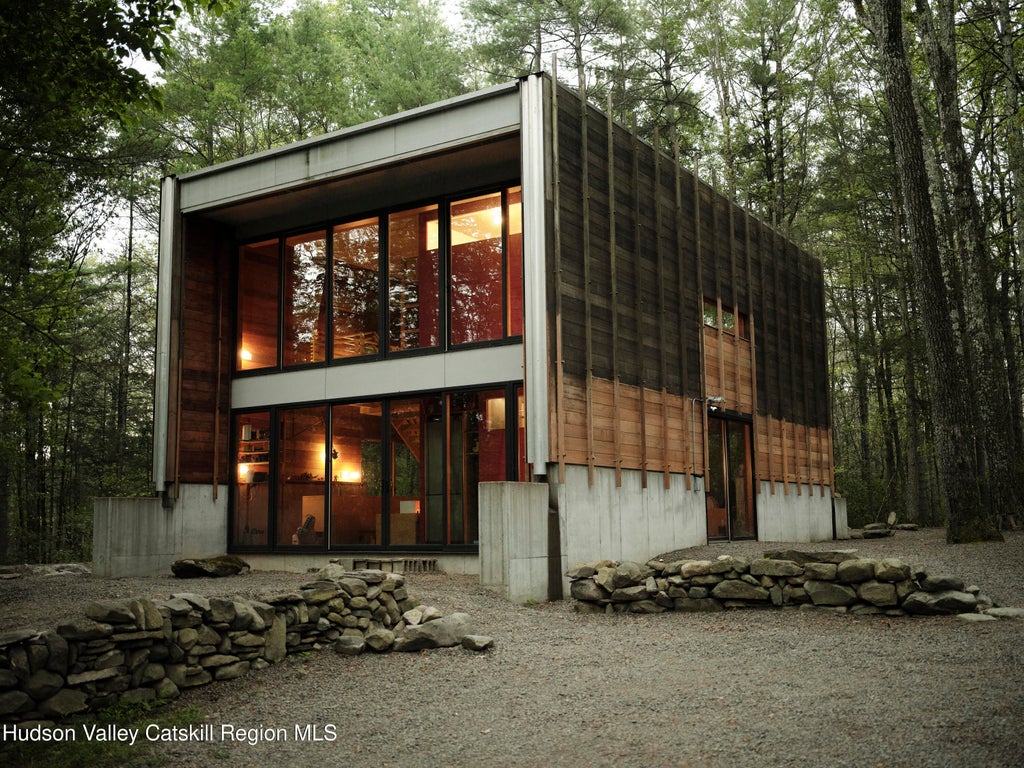Located on 24 acres of woods, this one-of-a-kind modern home offers a yearlong invitation to live inside a design magazine. Co-designed by two brothers part of a Chilean family of architects and designers of this house is as much a sculpture as it is a dwelling. Every piece of furniture is custom built to harmonize with the space, while bluestone floors anchor the ground level in cool elegance. Concrete and cedar walls form the framework of the home, softened by floor-to-ceiling windows that bring the outside in every season unfolds around you like a living diorama. The kitchen is a dream: Smeg and Liebherr appliances, an induction stove, a sleek speed oven. Meals become meditative here, surrounded by designer lighting by Paolo Rizzatto and the quiet murmur of forest beyond the glass. Two full bathrooms offer comfort and calm with a generous shower, the other with a deep soaking tub upstairs. The lofted bedroom spans the upper level, offering two distinct sleeping areas. Modern comforts throughout: radiant floor heating on both levels, upstairs heat pumps and A/C, a high-efficiency washer/dryer with Ozone Eco system, and thoughtful attention to maintenance through quarterly service visits are included. Located close to New Paltz and Woodstock, makes Hudson Valley moments possible from Mohonk, Minnewaska, to Inness. This is a home for those who appreciate quiet luxury, deep woods, and exquisite design. A year here is not just a lease- it's a retreat, and a reset of the rarest kind.