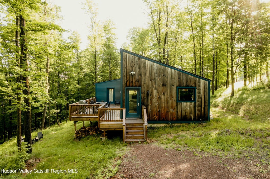Nestled into a picturesque hillside between the sleepy hamlets of Youngsville and Jeffersonville NY, Blue Hill is a turnkey, peaceful getaway just two hours from NYC. Every room is thoughtfully designed to take advantage of natural light and beautiful surroundings. From the spacious, wraparound deck, you enter the home into the well-appointed kitchen, featuring shaker style-cabinets and open upper shelving. A white tile backsplash perfectly compliments the wood countertops. A convenient island makes an ideal coffee station or work from home space. In the main living space, vaulted ceilings and plenty of glass flood the space with light and keep the home feeling open and airy. Double sliding doors onto the deck frame out a lovely view of the surrounding forest and distant ridgeline. A wood stove brings the cozy factor and makes the space feel complete. Off the main hallway, you'll first pass the convenient utility room with washer/dryer. Next is the first of two guest rooms. The vaulted ceiling keeps the space feeling open and inviting. A full bath features black hex tile floors and a white subway tile shower surround. The second bedroom features windows on two sides, making the most of the natural light and woodsy views. An L-turn off the main hallway leads past double hall closets to the primary suite. Among the many highlights here are the large picture window, generous en suite bath with walk-in shower plus a soaking tub with a view, and a private entrance onto the spacious terrace. The terrace itself offers abundant space for outdoor dining, entertaining and relaxing throughout the year. Outside, the seven acres have been left mostly wild, with lots of mature trees and ferns creating a calming natural environment. There's a great fire pit site too. If you can tear yourself away from this charming oasis, you're fifteen minutes or less from some of our very favorite Catskills Main Streets in Livingston Manor, Jeffersonville and Callicoon!