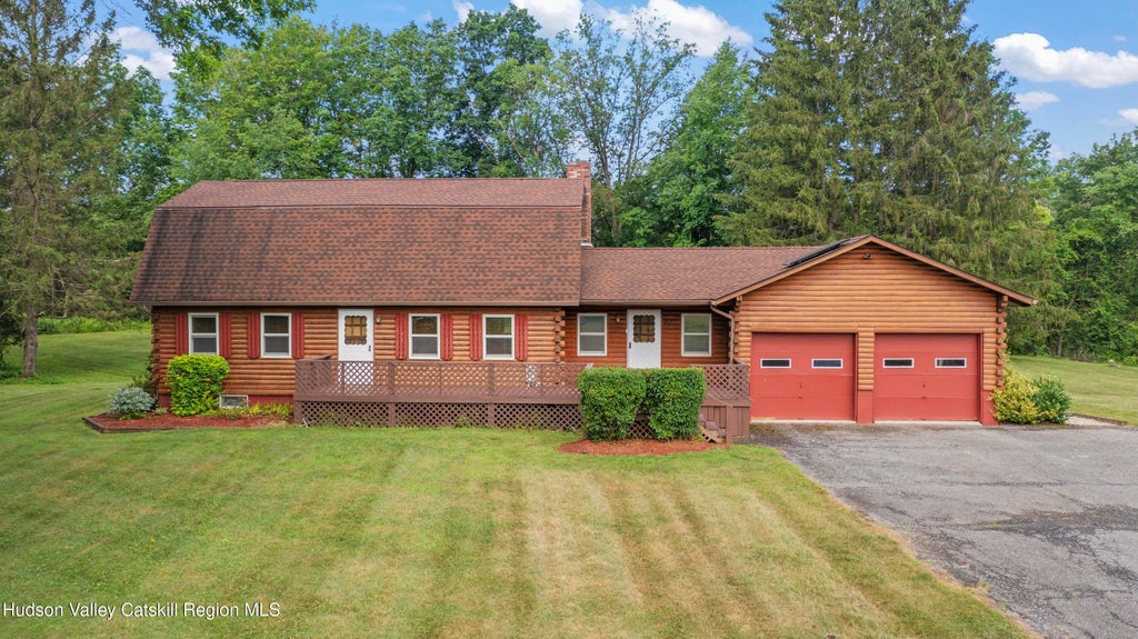 Germantown Log Home on 4.1 bucolic acres. Built in 1986 this three bedroom/2 bath home has had numerous recent upgrades. The first floor features a spacious living room, open kitchen and dining room, den with fireplace and a full bath, with laundry room. The second floor includes a large primary bedroom, 2 guest bedrooms and a full bath. Solid oak hardwood floors, maintenance free interior varnished wood walls, and beamed ceilings throughout. Heated and air conditioned by heat pumps with an additional oil hot water system in place as backup. Seventeen solar panels, which covers the cost of basic electric use. Power wall battery backup system. New stainless steel appliances including a 36 inch commercial grade, free standing, induction stove. Two car attached garage. Large front deck and large partially covered back deck. Very private backyard. Serene country setting with views of open fields and woods yet just a short distance to the village of Germantown.