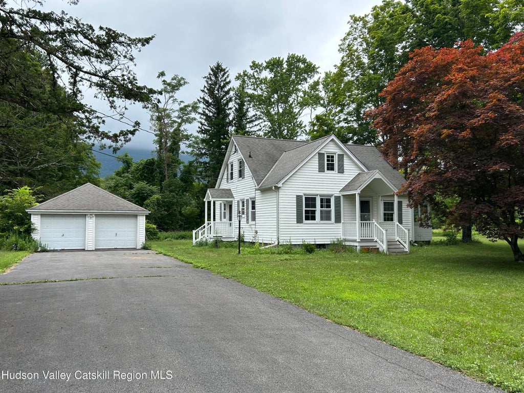 This absolutely charming 3 bedroom 1 bath Cape Cod style home features mountain views, a sunny 3 season room off the light filled living room, gleaming hardwood floors on main level. Cozy brick fireplace in living room, curved door frames, dining room that faces the pretty view, cheery kitchen with lots of cabinetry and 1 year old refrigerator. Closets are plentiful throughout. Upstairs, a roomy 3rd bedroom with oil baseboard heat. A large loft area perfect for a den, office or many other uses (not heated). There is also more easy access storage area on upper level. Full basement with 1 year old washer, dryer, 5 year old oil tank, updated electric, Burnham oil burner. New submersible well pump. 2 car detached garage. About 15 minutes to the village of Woodstock, the village of Saugerties, close to hiking, skiing, and easy access to NYS Thruway.