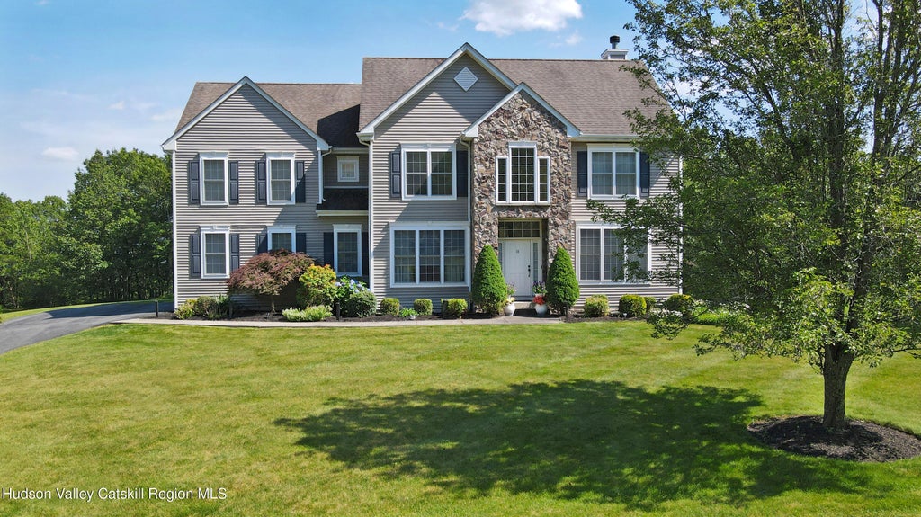 This meticulously maintained and beloved Colonial home in a beautiful community sits on an oversized 1.2 acre landscaped lot, offering privacy and views from its expansive oversized windows, the trex deck and stone inlaid patio! Enjoy almost 3,000 sqft. of finished space with a full basement that can also be completed having the plumbing for an additional bathroom in place and sliding glass doors that lead to the spacious stone patio. The paved driveway has plenty of parking for visitors and the two car garage with additional storage leads you into the home; next to the laundry room, half bath, walk in pantry and eat-in kitchen for easy transport of groceries. The kitchen is a chef's dream, having an abundance of counter space, an island, and even a dry bar that connects to a formal dining room. Off of the dining area of the kitchen is a set of sliding glass doors that lead to an updated trex deck with stairs to the patio and tree lined backyard. The living room is light and airy with two-story high ceiling and a wall of windows as well as a wood burning fireplace. A cozy family room completes the main level. Upon entering the front door, your senses are delighted by the natural light from the many windows, openness of the floor plan and view of the second floor hallway. The second floor features a capacious primary bedroom with a high ceiling, two walk-in closets, a double sink bathroom with a walk-in shower and a separate tub. There is another full bath shared among the other three sizable bedrooms. One of which also has a walk-in closet. The hallway opens up to overlook the bright living room and foyer continuing to delight the sense of integrated space and flow of this charming home. The community features a clubhouse, in-ground pool, tennis courts and playground; just a short stroll or drive away. Affordable 98.00 monthly HOA includes the maintenance of these enjoyable spaces, as well as recycling and refuse removal. Municipal water and sewer add to the peace of mind of low maintenance and quality living.