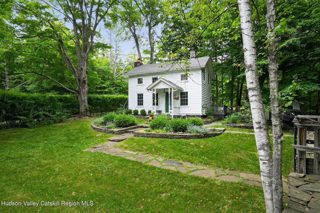 This classic 1890s farmhouse marries period charm with high-end modern amenities in a natural setting. Bordered by quiet woodlands, meadows and a bluestone wall, the house stands out as a gem. A spacious living room, flooded with natural light, flows seamlessly into a large separate dining room featuring window benches looking onto an ample side deck-perfect for morning coffee bathed in sunrise. The floor to ceiling fireplace with a Norwegian wood-burning stove is a warming heart of this home. The private primary suite is a thoughtfully appointed hideaway, with cathedral ceilings, a ball & club tub, stone tiled walk-in shower, generous walk in closet and a cozy meditation nook. A glass door opens directly onto a private deck overlooking woodlands. Framed by a bay window, twin skylights and a glass door that opens to the backyard, the second bedroom offers a serene sense of sleeping within the trees. It has its own large bathroom with walk-in shower and separate closet. A fully fenced zen inspired backyard features two bluestone patios overlooking a meadow with ample space for outdoor furniture, grill and firepit. An outdoor shower completes the peaceful, natural setting. a separate studio with vaulted ceilings, hardwood floors and its own dedicated heat and air conditioning offers the perfect space for creative pursuits or home office. This quintessential Woodstock country house in only minutes to the center of the Village and close proximity to the scenic High Catskills, yet only two hours from NYC.