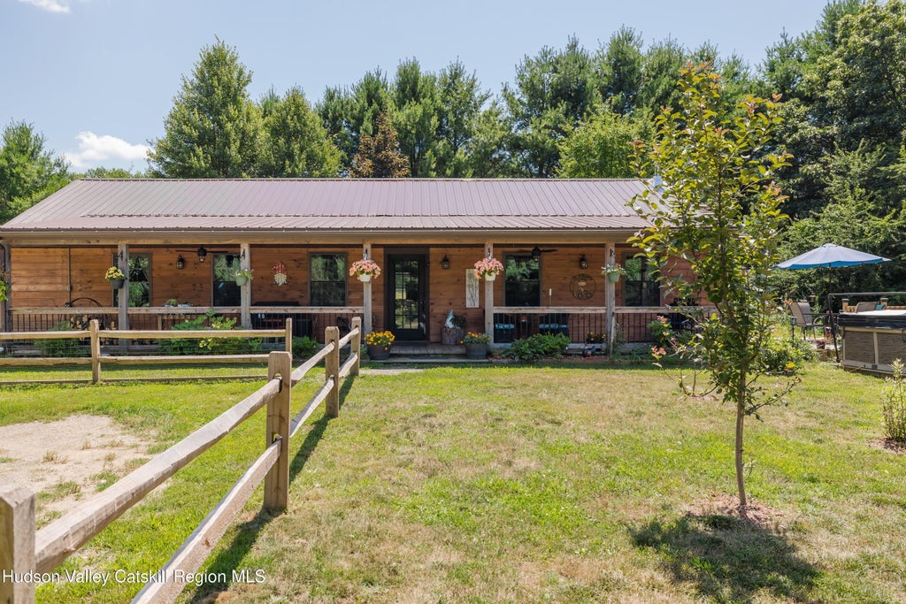 Introducing the Kinderhook Cabin, a well cared-for home where every detail has been thoughtfully considered and hand-finished by a master carpenter. Built in 2021, this ranch-style residence offers easy one-level living, a rustic-modern aesthetic and plenty of privacy, set on 5 acres along a beautiful winding country road between Kinderhook and Ghent. Step inside to a large entry hall that flows into a gracious open space for cooking, dining, and gathering anchored by a striking wood-burning stove. The U-shaped kitchen has stone countertops, a breakfast bar, tile backsplash, and solid wood cabinetry. Two bedrooms and two full bathrooms sit on the opposite side of the house--one with a stunning walk-in closet and en suite bath. The home has generous storage, including a separate laundry room lined with shelving. A rocking-chair front porch and expansive deck with hot tub and pool are made for all-day outdoor living—take a dip, sit down for a long lunch, then have a late-night soak while watching the fireflies. Many improvements and amenities include a new metal roof, efficient heat pump with discreet ceiling cassettes, storage shed, and above-ground pool. The quiet yet convenient location—10 minutes to Kinderhook, Valatie, and Chatham; 20 minutes to Hudson—is the perfect spot for both a weekend getaway or year-round residence.
