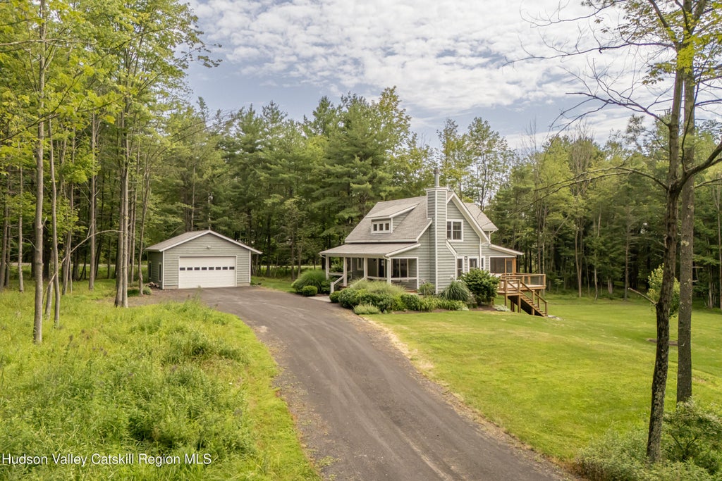 At the base of the mountains, surrounded by woods and wide-open sky, this custom-built 2020 home by Catskill Farms—a builder celebrated for timeless architecture and thoughtful design—offers the perfect blend of modern comfort and country charm on five private acres. With 3 bedrooms, 2.5 bathrooms, and a finished walk-out basement, the home is both warm and functional. Step onto the rocking chair front porch and into the light-filled open-plan main level, anchored by a central architectural staircase and a wood-burning fireplace. The spacious kitchen includes a large breakfast bar, beamed ceilings, KitchenAid appliances, and elevated fixtures—many from Schoolhouse—and opens directly to the living room and dining area. From here, access the deck—perfect for al fresco dining or a mid-day lounge—or step into the screened-in porch, outfitted with a pull-down projector screen for cozy movie nights. Upstairs, all three bedrooms feature vaulted ceilings and share a bright full bath. Downstairs, the walk-out basement features polished concrete floors, a second full bath with a tub, a laundry room, and multiple flexible-use spaces—ideal for guests, an office, home gym, or studio. Sliding glass doors open to a covered outdoor area beneath the deck with even more potential. Additional highlights include a top-of-the-line water filtration system, whole house generator, buried electric, and detached two-car garage—all wrapped in wooded privacy. Ideally located just minutes from the Ashokan Reservoir and local favorites like Tetta's Market, Arrowood Farms, Inness, Ravenwood, Minnewaska State Park, and Mohonk Preserve—and a short drive to the region's most beloved towns, including Woodstock, Kingston, Phoenicia, Stone Ridge, and Accord. Under two hours from NYC, but truly a world away.