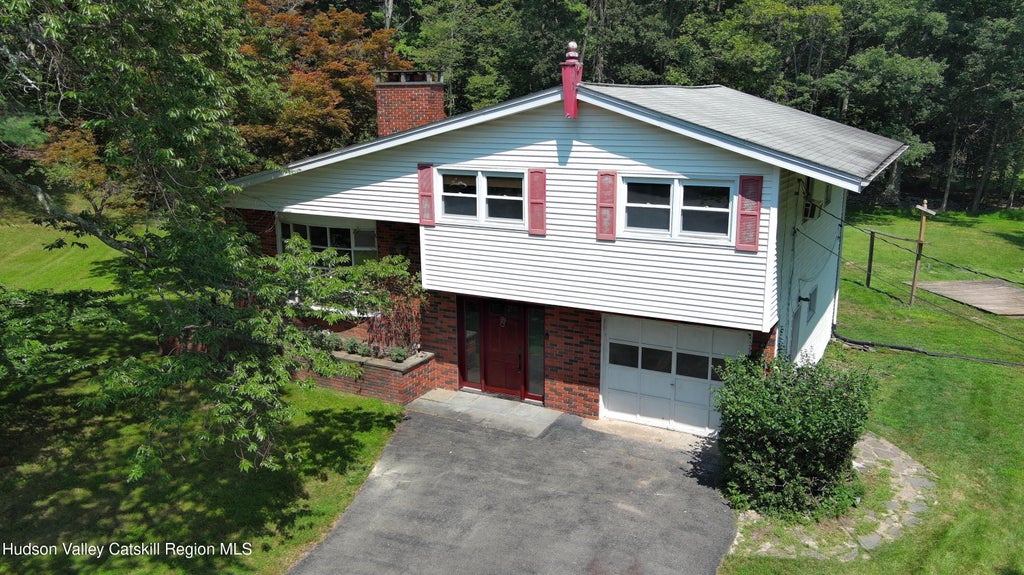 Beautiful location minutes from Woodstock village center. This home is convenient yet protected at the end of a cul de sac with privacy in the back yard and lawn surrounded by woods. Enjoy the layout which offers several places to gather and office on the ground floor. Brick fireplace on each floor, one with wood stove insert. Beautiful oak floors and a bluestone patio just outside the kitchen sliding door leading to a masonry grill area. Big window areas let in the pretty setting. New 1000 gallon septic. Woodstock schools but lower Hurley taxes. Home is priced to reflect some needed work, but well worth it in this great, safe and quiet location. Sump pump has back up power system, soapstone stove available for installation. 8000kw generator comes with house.