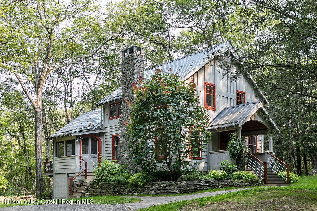 Welcome to Lost Quarry, your own hidden sanctuary, just minutes from the heart of Stone Ridge. This handcrafted post-and-beam retreat lives like a luxe treehouse, sited thoughtfully on 10 lightly wooded acres framed by mossy lawn, sweet ferns, and timeless bluestone walls. Reclaimed barn beams, warm wood floors, and a classic Rumford stone fireplace bring character and craftsmanship to the main living space. The beautifully appointed open kitchen, complete with Viking range, island, and large banquette flows seamlessly to a generous hardwood deck, ideal for morning coffee or sunset dinners. The surrounding trees have thoughtfully placed up-lights that illuminate the canopy over the deck for truly magical evenings. A smartly designed screened porch entrance opens to the kitchen and living room; part mudroom, part peaceful perch to take in the wooded surroundings. Step outside to enjoy the magic of the property: a softly lit firepit for evening gatherings and a bluestone-wrapped outdoor shower that feels like a spa retreat in the forest. The light-filled primary suite is privately located on its own level with an ensuite bath, private deck, and amazing views overlooking the woods. The basement has wine storage, substantial built-in shelving and whole-house water filter and softener. On the third level, two additional bedrooms, a full bath, and a dedicated home office provide privacy and flexibility, whether you're hosting guests or working from home. Year-round comfort is built in, with heated floors on the main floor and in the primary bedroom and bath, and split units throughout for cooling and supplemental warmth. Underground business-class internet ensures seamless remote work, and a newly installed whole-house generator keeps everything running smoothly, no matter the weather. Convenient 220-volt EV charger in driveway with underground connection to the house was installed last year. With over 300K in recent improvements, the home is worry free. This serene oasis is only minutes from Inness for world class golf and dining, Mohonk Preserve and Minnewaska State Park for hiking, climbing, and biking. Under 30 minutes to Kingston and New Paltz and 90 minutes from the GWB. Call this your upstate exhale - Lost Quarry makes a strong case for staying longer, or never leaving at all!