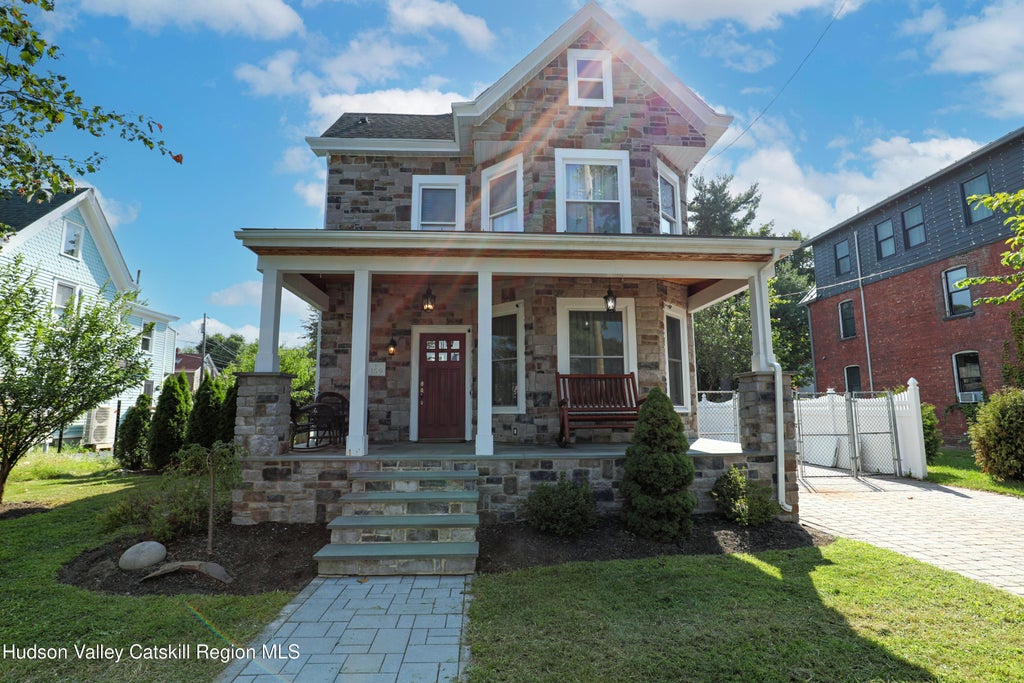 Curb appeal abounds with this well-maintained two-story home located in the heart of Kingston. From the inviting front stone patio to the backyard custom pavers, this property is truly a standout. Step inside to a welcoming foyer that flows into a spacious living area, dining room, and a lovely eat-in kitchen. The open layout is enhanced by hardwood floors and high ceilings throughout. The kitchen has been tastefully updated with granite countertops, a tile backsplash, stainless steel appliances, a center island, and ample cabinet storage—making it the true focal point of the home and perfect for entertaining family/guests with easy access to the backyard. The first floor also offers a convenient half bath with washer and dryer. Upstairs you'll find three bedrooms with ample closet space, plus an additional room ideal for a nursery or home office. A full updated bath completes the second floor. A walk-up attic provides even more storage, and the partially finished basement adds flexibility. Outside, the main highlight awaits—your own private retreat featuring a heated saltwater inground pool, fully fenced for privacy and relaxation. A detached one-car garage provides extra storage for your car or outside toys. Enjoy the ease of municipal water, sewer, and natural gas. Located just 5 minutes from both Uptown's historic Stockade District and the vibrant Downtown Kingston Waterfront, this home truly has it all. Don't miss the opportunity to make it your own!