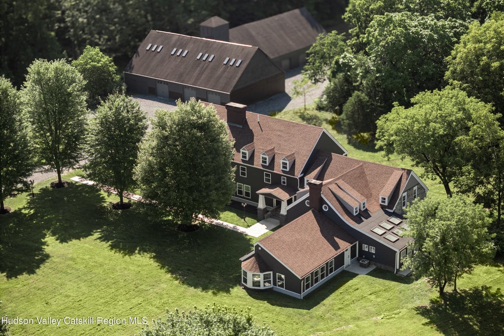 Welcome to Stone Manor, an 18th century inspired estate set on eight verdant acres dotted with mature trees and framed by gentle woodland glades. This fully furnished and turnkey residence is more than just a home. It is an experience where centuries-old craftsmanship meets a thoughtful renovation for a truly one of a kind estate! Arrive along the lantern lit drive and enter into the grand entry hall where soaring ceilings and a central staircase welcome you into a home that artfully balances historic character with every modern convenience. The ground floor unfolds on two distinct wings. On one side, a spacious living area with striking stone hearth seamlessly flows into a gourmet kitchen outfitted with custom cabinetry, an ample pantry, convenient undercounter appliances, and a generous island complete with built-in cooktop and double ovens. Just beyond, a light-filled gallery lined with windows creates an elegant backdrop for formal dinners, casual cocktail gatherings, or simply soaking in the view of the grounds. Across the foyer, the other wing features an additional well-equipped kitchen with an abundance of natural light from its many windows and skylights. An adjoining den with stone details from the original Dutch stone farmstead leads to an expansive and bright sunroom where skylights and picture-perfect windows flood the space with daylight. A generously sized bedroom and full bath complete this wing making it ideal for multi-generational living, dedicated guest quarters, or even a home-based office suite with its own entrance and amenities. Down a striking set of stone stairs, the original stone cellar offers a unique space for a home gym, game room, or wine cellar. Completing the first floor is a half bathroom off the entry hall and an ample laundry room. The upper level, divided by the central staircase, includes three spacious bedrooms and a beautifully appointed bath with deep soaking tub and glass-enclosed shower in addition to the sweeping primary suite with cathedral ceilings, brick fireplace, and a loft overlooking the suite which is perfect for a reading nook, meditation space, or quiet work corner. The primary bath, clad in marble with a freestanding tub, offers a spa retreat. Every element of this home has been thoughtfully reimagined for modern comfort and long-term peace of mind. It has been completely overhauled including new kitchens and bathrooms, finishes and fixtures, plumbing and electrical, central air and heating system, and water filtration system. The exterior has also been upgraded with new siding, windows, shingle roof, and drainage system. Outside, are several distinct patio areas for lounging and dining as well as a custom fire pit for gathering under the night sky. Adjacent to the main house, a 7,000 sq ft rustic barn with five garage bays and a lofty upper level awaits your vision, whether a workshop, car collection, artist's studio, horse stables, or all of the above. Located in the Town of Marbletown, where Kingston meets Stone Ridge, Stone Manor is just minutes from popular towns with a host of dining, shopping and recreational options making it both a distinctive country escape and a vibrant base for exploring the cultural and natural riches of the Hudson Valley and Catskills. Make this singular estate your legacy!