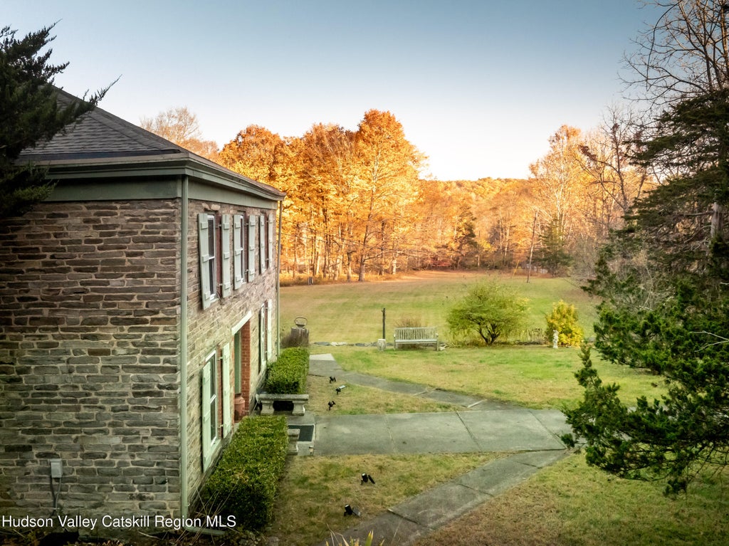 Welcome to Stonewall Farm, a rare 20-acre retreat featuring a charming 19th Century stone house and outbuilding less than two hours from Manhattan and minutes from the New Paltz village center. Privately set at the end of a long driveway flanked on each side by its namesake stacked-bluestone walls, the property features both meadows and woods plus its signature foursquare stone farm house built in 1820 by William Brooks and listed on Ulster County's historic places registry. The house features four bedrooms and two baths (one full, one half), plus a 30-foot living room with fireplace opening to an end-to-end screened side porch overlooking a meadow. The dining room also has a fireplace, and the renovated kitchen features custom dovetail jointed cabinetry, a gourmet 48-inch range with hood and pot filler, and other high-end appliances. Upstairs are the four bedrooms, an oversized bathroom with spotless vintage tilework still in place, and a large central walk-in closet for storage. Throughout the house are classic recessed windows with stunning glass panes, hardwood floors and plenty of light. The property also includes a standalone studio building with a two-car garage plus a finished library room and office space, perfect for at-home work, overflow guests or additional storage. Recent upgrades include a whole-house Generac generator and ductless central-air and heating systems, installed in 2015. This a unique opportunity to own a remarkably private compound, minutes by car or bicycle from the Walkway Over the Hudson, MetroNorth and Amtrak train service in Poughkeepsie, and the charms of New Paltz, one of the Hudson Valley's most popular college towns.