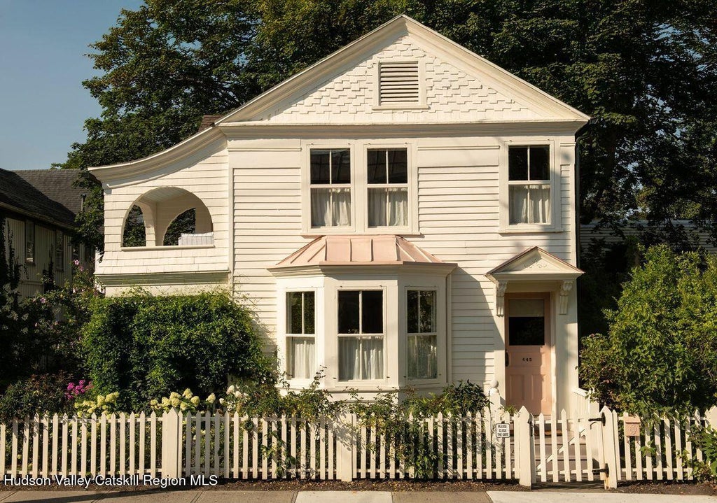 A wonderfully charming c1870 Queen Anne cottage with a detached guest house in the heart of Hudson. Set amongst beautiful perennial gardens, the home's fabulous sloped roof covers stacked porches. The home has been slowly and carefully restored, inside you'll find reclaimed old growth Hart Pine wide board floors & exposed beams. The kitchen was built by a local craftsman with inset cabinetry, Imperial Danby marble countertops and DeVOL's unlaquered brass hardware. The gorgeous AGA gas range is both a workhorse and a fabulous accessory. There is a pantry & powder room off the kitchen, and cafe curtains from East London Cloth. Upstairs are three bedrooms, two of which walk out to a perfectly private covered second story porch framed by shingled archways-- it overlooks the neighborhood & garden and offers a private and peaceful place to sit or work. A full bath has William Morris wallpaper, Waterworks fixtures and a deep soaking tub. Out back, the historic detached carriage house now serves as studio space. A full bath was added and finished with marble tile and brass Waterworks hardware. The kitchenette was custom built with an antique farmhouse sink and Liehbehr refrigerator. The yard is peaceful and sweet, the bluestone patio lined with rhododendrons and hydreangeas. The low maintenance gardens add shade and privacy. The property is made up of two tax lots offering future flexibility, and there is off-street parking in the rear. 445 Union is a turnkey, period-focused labor of love walkable to Amtrak and the vibrant 18th century restaurant, boutique and antique shopping district of the Hudson Valley's darling rivertown.