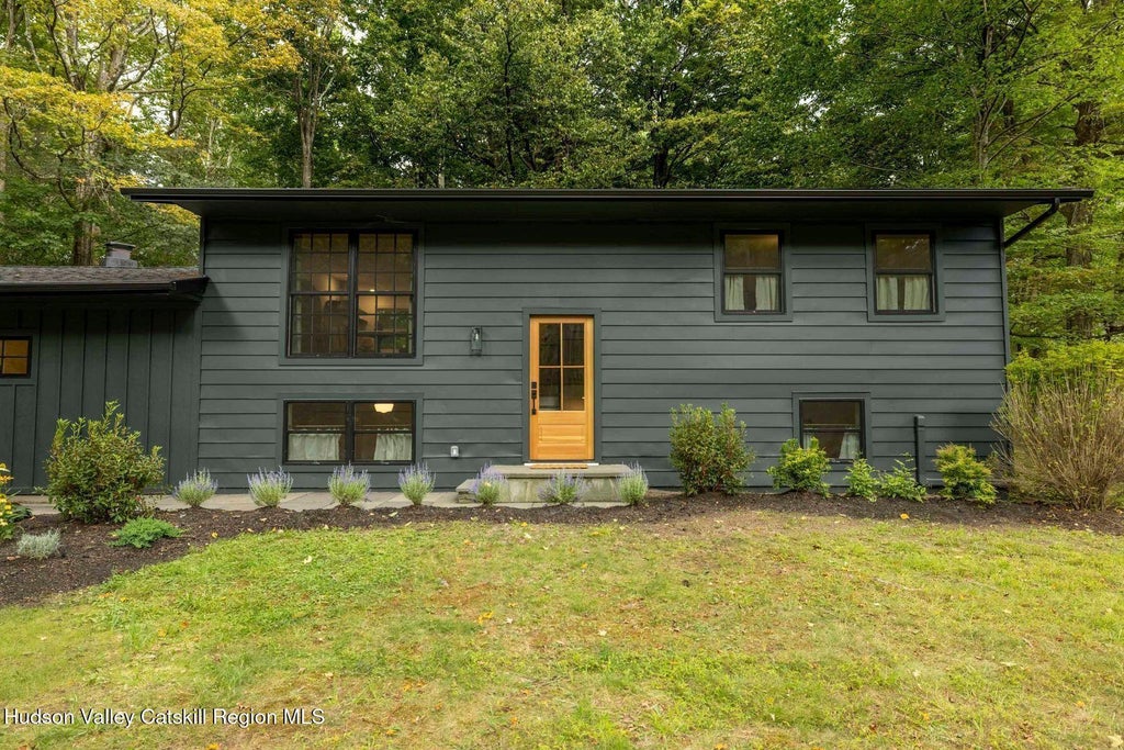 Tucked at the end of a quiet cul-de-sac, the Bearsville Social House is where ease, beauty, and connection come naturally. Set on a private acre in a stroll-worthy neighborhood, the home is just moments from the Bearsville Complex with its restaurants, bars, live music, and nearby parks and the new library. This chic and newly renovated home is minutes from Woodstock's town center. Life here feels both tucked away and close to everything. The home's deep green exterior blends beautifully with the landscape and hints at the attractive design character inside. With 2,350 square feet, there's space to spread out, gather, and relax. The living room is the heart of the home, where the original fireplace adds warmth and sliding doors open to the deck for indoor-outdoor living. Desirable built-in details, like the custom hutch, bar, and reading bench with generous storage, add to the home's charm. Classic English-style elegance and welcoming comfort meet in the kitchen, with handmade tiles, custom cabinetry, quartz counters, brass finishes, and a coffee bar framed by an arched detail that makes mornings feel more special. The kitchen is open to the dining room, which invites candlelit dinners and a deck perfect for al fresco dining under the breezy treetops. Upstairs, two airy bedrooms and a stylishly designed finished bath with imported limestone radiant-heated floors and handmade shower tiles create a sense of earthy luxury and retreat. Downstairs, the home opens to even more possibilities with two additional dreamy bedrooms, a second full bath with its own sophisticated design, a storage/ laundry room, and a flexible room that works perfectly as a playroom, den, wellness gym, home office, or media space. This intentionally designed house was entirely renovated with meticulous, top-of-the-line designer features, and no detail was left unaccounted for. Some of the many updates include new windows, a roof, high-end appliances, refinished floors, and efficient split systems, which make the home as practical as it is beautiful and welcoming. A complete list is available upon request. The property's outside grounds invite you to slow down and enjoy. It is a perfect place to entertain guests and loved ones. Two sweeping decks connect to a pea-gravel courtyard anchored by a fire pit, all tucked behind a privacy fence. A large new outbuilding waits to become a studio or workshop, while the fenced yard, garden/pool potential, and two-car carport round out the space. The Bearsville Social House offers the perfect blend of elegant design ethos, community, and charming retreat that sets a coolness factor in one of the area's most beloved & desirable towns.