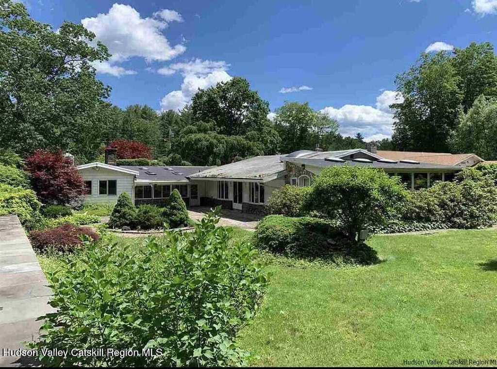 Stunning Mid-Century Retreat in Prime Location! Nestled in a private setting on a beautifully landscaped .54-acre lot in West Hurley, this meticulously updated 3-bedroom home with an office and sunroom offers over 2,200 square feet of sophisticated living space. Perfectly positioned between the vibrant towns of Kingston and Woodstock, you'll enjoy the tranquility of nature while being within easy walking distance of everyday conveniences. Step inside and be captivated by the expansive living room, featuring dramatic cathedral ceilings and a magnificent wood-burning fireplace. An abundance of large skylights and windows throughout the home beautifully brings the outside in, filling the space with natural light and offering lovely views of the surrounding landscape. Adjacent to the living area, a bright and airy sunroom provides a wonderful space to relax and soak in the natural light. The heart of this home is the beautifully updated gourmet kitchen. Boasting custom cabinetry, sleek Quartz countertops, marble flooring, and a high-end Sub-Zero refrigerator, this kitchen is a chef's dream. The open layout seamlessly flows into a large dining perfect for entertaining. This residence offers three comfortable bedrooms, plus a dedicated office space - ideal for remote work or creative pursuits. Both full bathrooms have been thoughtfully updated with modern fixtures and finishes. Enjoy year-round comfort with central AC and individual mini-split units in every room, providing personalized climate control. Benefit from a reliable water filtering system connected to the private well. The professionally landscaped grounds are a true oasis, enclosed by charming stone walls and fencing, ensuring privacy and creating an inviting outdoor space. An attached one-car garage offers convenience and protection from the elements. Imagine stepping out your door and being just a short stroll away from the scenic Ashokan Rail Trail, perfect for walking, biking, and enjoying the outdoors. You'll also find a grocery store, bank, gas station, and public transportation, including a Trailways bus stop, all within easy walking distance.
