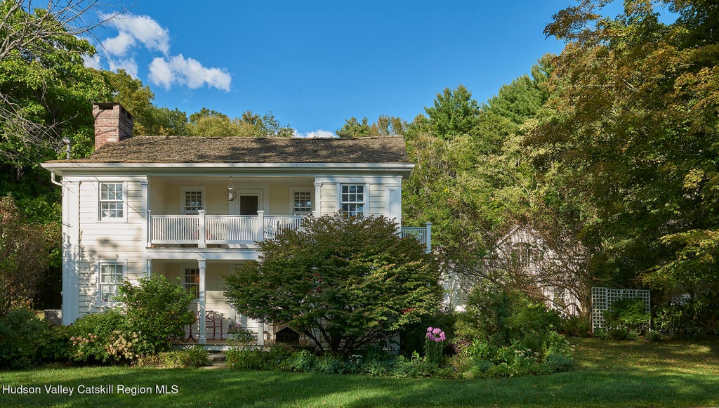 This historic home was constructed by Thomas Bishop, a veteran of the War of 1812 in the early 1800's and was once known as Bishop's Tavern. It began as an inn and tavern on what was once, the Stockbridge and Hudson stagecoach line. Since then it has been lovingly tended and updated with an eye to preservation. Located on a quiet country road in Red Rock and surrounded by mature gardens and stately trees this property has much to offer. The front of the house has access to two covered porches, one on each floor that offer seating and views of the pasture and hill beyond. Entering the home from the side, this open porch entry brings you into a large parlor that stretches across the length of the main house. A newly built fireplace is flanked by floor to ceiling windows giving light to the original ceiling beams and wide board flooring. A full bath and pantry are set off this room. To the rear of the house is a combination kitchen and sitting room with access to the wrap around stone terrace through two sets of French doors. This room is a light and airy space with its generous windows and a propane stove for winter warmth. On the second floor there are three comfortable bedrooms; one with a working fireplace, one with a Juliette balcony and culminating in the main bedroom with a vaulted ceiling and a Palladian window overlooking the gardens and the two story barn/garage. The house and barn are set on one acre of land with a half acre parcel and a small pond across the road for view protection. More land available across the street of six acres Listing # 20254357. Queechy lake rights for swimming, boating and ice fishing just up the road. Come step into history and become part of the story of this unique property.