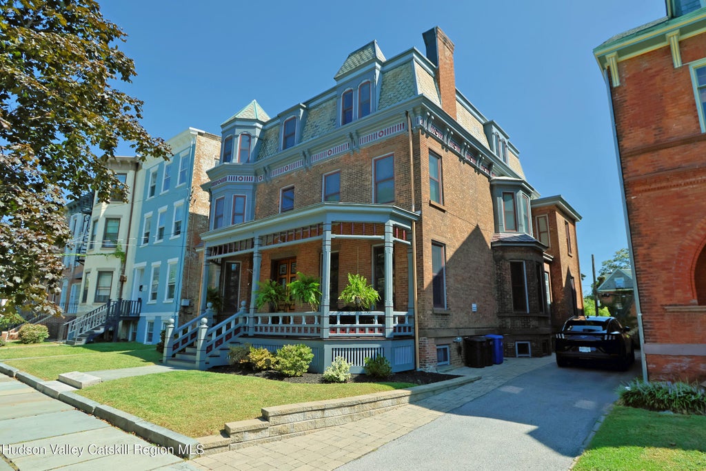 Absolutely Stunning brick Second Empire Victorian Mansion w/beautiful Hudson River Views! Located just 60 miles from NYC, this 1884 architectural treasure (on the National Register of Historic Places) is remarkably original, yet has the modern upgrades that make it a pleasure to live in today. Whether you are enjoying the Hudson River views from the west side of the home, enjoying the view of the other historic homes from the east side of the home, or enjoying delicious details, craftsmanship & gracious spaces inside the home, there is ample eye-candy to keep you satisfied. This is a home that really needs to be experienced in person to be fully appreciated. It was designed by Architect Elkanah Shaw (whose family also produced all of the millwork for the home) for one of Newburgh's economic leaders of the day (see the last listing photo) - and as director of the Edison Electric Illuminating Company in Newburgh, Shaw worked with Thomas Edison to electrify the home during its construction (one of the very 1st homes in the world to be built with electrification). The quality of construction is strikingly evident throughout: detailed plaster work, high quality & highly-detailed millwork, basement brick walls supporting all interior walls above them, 5 interior staircases, 7 fireplaces, gorgeous front & rear porches, etc. Modern upgrades include: 200A electric system, modern plumbing, modern gas boiler, appropriately updated bathrooms & kitchen, refurbished box gutters & EPDM membrane top roofs (w/light grey silicone coating), & over 50 new double-paned architecturally-approved windows, to name a few. The interior spaces are spacious but still warm & inviting. The central hall floor plan provides a logical and comfortable flow, especially on the 1st floor - making entertaining (even large events) a pleasure. In addition to the primary bedroom suite, with its own full bath and full-room walk-in closet/changing room/laundry (with river views), there are 8 other bedrooms w/closets to use however you wish. Some are currently used as home office space, a media room, and extra family room, etc. The basement is has the same layout as the 1st floor & includes a well-equipped gym. The Kitchen retains its mid-century cabinetry & has new stainless appliances, ample pantry closets, and its own staircase leading to a full pantry room with a 2nd freezer. The 2-story rear porch & rear patio/yard are also great for entertaining - or just enjoying a quiet meal or morning coffee while enjoying the river view! There's also garden shed in the backyard w/lights & outlets to keep things charged. The driveway can support 3 cars & features a 50A outlet for a stage 2 car charger. It's easy to see why this home has appeared in several films and television shows over the past 10yrs. So many similar urban homes from this era were either demolished (during the destructive period of ''urban renewal'' of the late 1960s to early 1980s) or cut up into apartments over the years. This one managed to remain owner-occupied since its construction, and has survived, fully intact. No small feat! Walkable to mass transit, library, dining, shopping, waterfront, parks, etc. Newburgh was the ''taste-making center'' of the 19th century and is renowned for its beautiful 19th century homes - this is your chance to own one of the very best of them that still exists. A very rare opportunity, indeed. (more historical/home info available upon request)