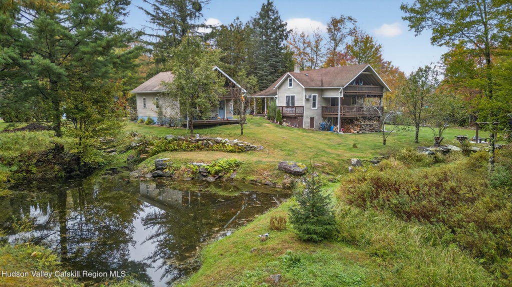 Discover your sanctuary! Pride of ownership shines throughout every thoughtfully crafted detail. This thoughtfully designed residence offers a perfect blend of comfortable living and natural beauty that will capture you from the moment you step inside. The main level welcomes you with a cozy living room flowing seamlessly into the dining area and kitchen, complete with butcher block counters. Step through sliding glass doors onto your deck and prepare to fall in love with the creek that meanders through your entire backyard. The first floor hosts two bedrooms and a full bath. Upstairs, you'll find a versatile den with upper deck access, convenient office space, and the primary bedroom featuring a spacious walk-in closet and full bathroom. With three decks total, outdoor living reaches new heights here. Below, the full walkout basement houses a wood stove capable of heating the entire home. The two-story garage accommodates two vehicles while offering storage and a loft area with its own pair of decks - perfect for an artist studio or future guest quarters. The outdoor spaces truly set this property apart. Three decks on the house and two on the garage offer multiple vantage points to enjoy the scenery, while the fire pit with pergola creates an inviting gathering spot. Established garden with greenhouse, and yes, even a chicken coop for the aspiring homesteader. A charming pond offering fishing and ice skating in the winter. Adventure awaits nearby with world-class entertainment at Bethel Woods Center for the Arts, gaming excitement at Resorts World Catskills, family fun at The Kartrite Resort and Indoor Waterpark, and hiking at Sam's Point. The pristine waters of Neversink Reservoir offer additional recreational opportunities. This isn't just a house - it's a lifestyle where every sunrise brings new possibilities and every sunset promises tranquil evenings in your personal paradise.