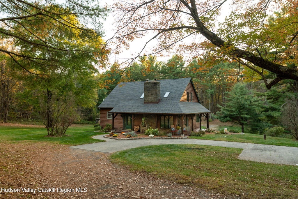 Follow a long, winding driveway through a canopy of trees to find a rustic-contemporary retreat: Kinderhook Haven, your new Hudson Valley sanctuary. Perched on a gentle hill, the home overlooks twin ponds below, offering a perfect vantage point from the wraparound porch or the rear deck to watch wildlife like herons, deer and turkeys. A path leads to a peaceful clearing under a mighty oak, where friends can gather around a fire pit by the larger pond. Inside, the home exudes both comfort and artistry. The great room rises to cathedral heights, fitted with reclaimed barn beams and wide plank pine floors, and is anchored by a dramatic floor-to-ceiling stone fireplace. The open-concept farmhouse kitchen flows into a light-filled dining area, where two sets of French doors connect to the rear deck and yard outside. The layout offers expansive, open living areas ideal for entertaining, along with quiet corners and nooks for reflection. Five bedrooms across three levels offer privacy and ample space for family and friends. Whether hosting a weekend dinner or curling up by the fire, the balance of scale and intimacy feels effortless. In addition to the attached garage, the nearby 1,200-square-foot barn/garage provides space for creativity and utility. Wander past the barn, deeper into the forested acres, and you're greeted by a trail that winds toward a hidden stream running along the property. Despite its remarkable privacy, this sanctuary is just minutes from the best of Columbia County's culture and cuisine. Five minutes away you'll find locally-sourced restaurants and farm stands in the historic village of Kinderhook, and world-class art attractions like The School by Jack Shainman Gallery and the Art Omi sculpture and architecture park. Indulge in breakfast at The Bartlett House, and spend leisurely afternoons at the Hudson Chatham Winery or the cidery at Chatham Berry Farm, enjoying craft flavors unique to the region. Outdoor adventure is never far. Ride the scenic Empire State Bike Trail, visit Olana, Frederic Church's breathtaking Hudson River School estate, or spend a day skiing, hiking, or antiquing your way through the surrounding villages and mountainsides. The house is 25 minutes from the Hudson Amtrak station, 40 minutes from the Albany airport, and just two and a half hours from New York City. This is not just a home; it's an invitation to be part of a unique setting filled with natural beauty. At Kinderhook Haven, ''escape'' doesn't mean isolation, it means returning to what matters most. Welcome home to the heart of the Hudson Valley.