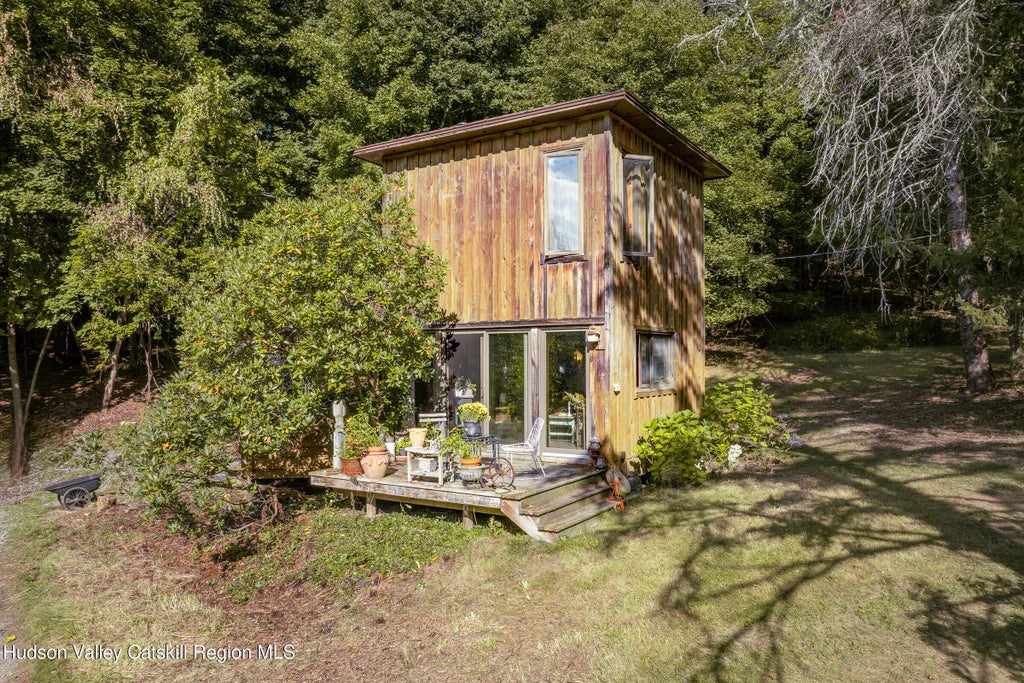 Welcome to 1635 High Falls Rd! On the market for the first time in over 30 years, this charming Frank Lloyd Wright inspired, passive solar design offers a tranquil retreat. The main home is nestled on just over three park-like acres with mature plantings and open lawns. Board and batten exterior is matched by interior exposed beams, bespoke brick and wood floors, ample light, wood stove, and first floor bath. The main house has both a porch and a small deck. Upstairs are two bright bedrooms and a walk-in closet (potentially a second bathroom). The main house has a newly installed leach field which serves both the main house and red studio building. The property includes several structures from the days when it was part of the Rip Van Winkle Camp. Across from the main house is a structure that served as a first aid station. A short walk from the main house sits the ''studio'' building (approx. 22x36) with a south facing covered porch. The studio building has been partially renovated with a new roof, repaired porch, and new leach field (shared with the main house). The building has electricity and water lines, with a non-functioning kitchen. Adjacent to the studio building sits a small south facing greenhouse which is wired for electricity. (approx. 8x12) The property includes two other original camp structures (approximate footprint is 18x36) are potential studio, storage, gathering spaces. These structures are in need of complete renovation to restore their historic charm. Bring your vision to this unique and charming property. Whether your goal is a family compound, a place to create, an income property, or some combination of all three, you will not be disappointed! Some photos may have been taken with a wide angle lens. Buyers agent to confirm all pertinent information including square footage, zoning, taxes, etc. Information is deemed reliable but not guaranteed.