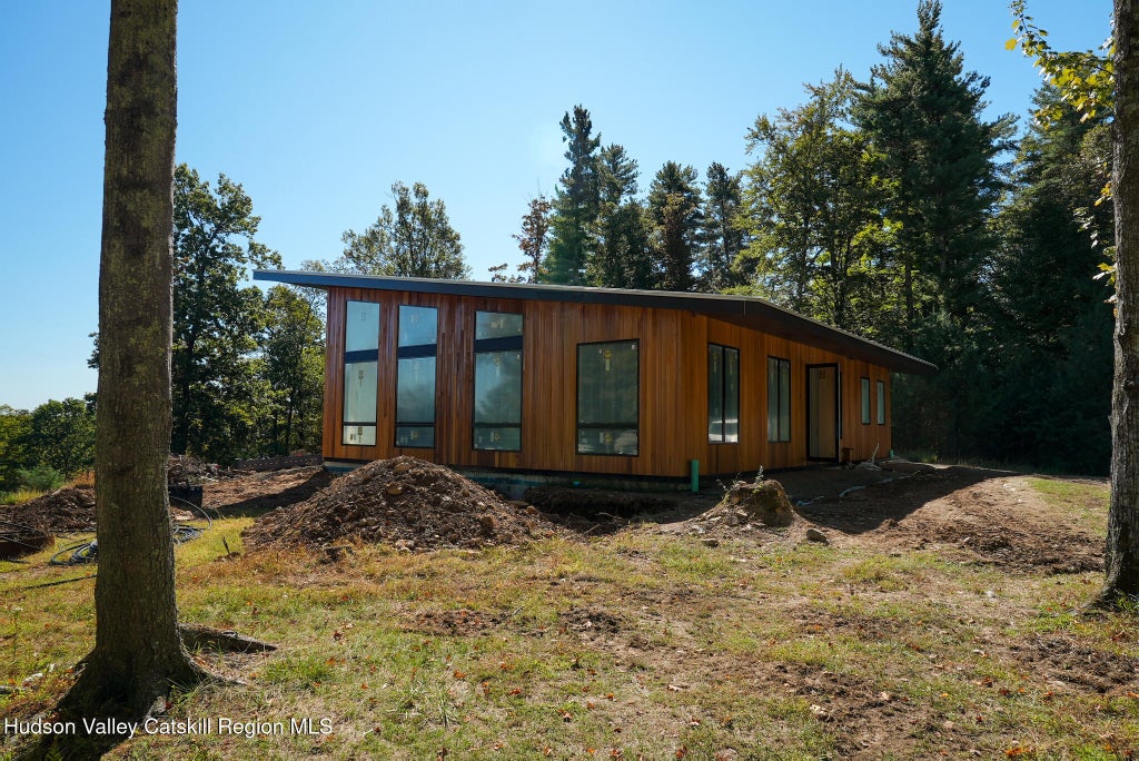 Poised for delivery in the coming months, Ango is an expression of light, space, and serenity. Situated on six acres of supreme privacy, this newly constructed residence by Hudson River Homes captures the essence of contemporary minimalism, framed by sweeping southern views and an architectural profile that pays homage to the art of flight. Every element of Ango has been curated to merge the outdoors with the interior experience. Walls of glass encase the home on all sides, flooding each space with natural light and uninterrupted views of the surrounding landscape. Inside, twenty-foot ceilings and a free-flowing floor plan invite a sense of openness and calmness where the freedom of nature becomes part of daily life. Encompassing 2,640 square feet of functional living space, this three-bedroom, two-bath residence (with optional powder room) is anchored by a dramatic great room spanning over 1,000 square feet. Here, a double-sided wood-burning fireplace divides the living and dining spaces, creating a natural rhythm between warmth and transparency. Four ten-foot sliding glass doors and expansive fixed-frame windows by Pella extend seamlessly to the outdoors, blurring the line between interior and landscape. The primary suite is a sanctuary of light and repose, featuring a walk-in closet, private commode, and an en suite bath with a curbless shower and a 65-inch soaking tub set beside a wall of glass. Every finish has been selected for its tactile quality and visual restraint. The kitchen serves as the home's heart, designed for both elevated entertaining and daily ease. Custom cabinetry from Mod's 'Naturals' line features soft-close hardware and abundant storage. Calacatta marble countertops, a Fisher & Paykel built-in appliance suite, and matte black fixtures combine form and function with effortless sophistication. A generous pantry, ample prep space, and windows on all sides complete this culinary haven. Constructed on a radiant-heated slab-on-grade foundation, Ango is as efficient as it is elegant. Finished concrete floors with triple-zoned radiant heating, central air conditioning, and an advanced ERV (Energy Recovery Ventilation) system ensure year-round comfort and air quality. The standing-seam galvalume roof, concealed gutter system, and weatherproofed western red cedar siding combine architectural integrity with timeless durability. Technical Highlights Structure: Stick-built frame with Simpson strong walls, glulam headers, 2x6 interior walls, LSL king studs & LVL roof system Envelope: Zip R sheathing, closed/open cell spray foam insulation Roof: Standing seam galvalume with recessed, concealed gutter drains Windows: Pella Architectural Series, double-pane low-E glass Heating & Cooling: Central HVAC plus triple-zoned radiant heated floors Ventilation: Whole-house ERV system and dehumidifier Water Systems: On-demand water heater and whole-house filtration Bathrooms: Toto wall-mounted toilets, curbless showers, stainless steel Schluter trim, Signature Hardware fixtures Accessory Building: Included on site, offering flexible living or studio use Ango represents a rare balance of architectural purity, functional design, and a profound connection to nature. For those seeking to dwell in peace, this home offers the freedom of open space, the luxury of craftsmanship, and the serenity of the Hudson Valley at its most refined.