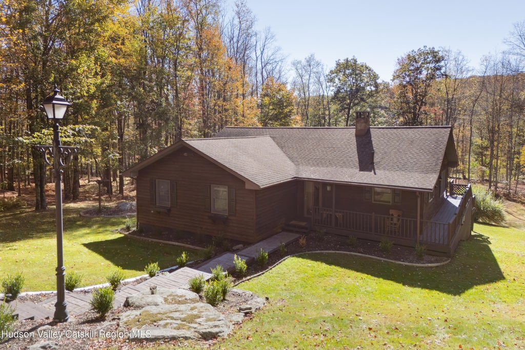 Welcome to this turnkey Catskills retreat where modern comfort meets mountain charm. Recently reimagined by the current owners, both professional designers, the home has been thoughtfully renovated with a deep commitment to beauty, functionality, and timeless style. Spacious yet warm, it's equally suited for those seeking a peaceful personal escape or a proven rental property. The main level features an airy open-concept layout, with vaulted ceilings and big windows in the living and dining areas that fill the space with natural light. The updated kitchen flows seamlessly into both rooms, creating an easy gathering space for cooking, dining, and connecting. Sliding doors open to an expansive deck overlooking the peaceful backyard. The spacious primary suite is a private haven with ensuite bath and direct deck access. Two additional bedrooms and a full bath complete the main level. The fully finished lower level provides even more room to unwind or host. A generous second living area with a wood stove is perfect for cozy movie nights or game days, while two additional rooms offer flexible space for guests, home office, or gym. The spa-like full bath, complete with steam room and soaking tub, adds a luxurious touch. Step outside to your own slice of Catskills magic. The two-tiered backyard offers multiple spots to lounge, play, or stargaze. Enjoy mountain views, a garden-ready area, and evenings gathered around the firepit. A detached 2-car garage offers additional space for storage or workshop space. Every finish was selected with designer-level integrity and intention, including: honed black granite kitchen countertops, hardwood flooring, slate entryway tile, Clé moroccan zellige tile, Clé marble tiles, Clé cement tiles, wood beadboard wall finishes, new wood front door, upgraded lighting throughout, and new premium wool Berber carpet in the bedrooms. Perfectly situated for outdoor adventure, the home offers easy access to hiking in Sundown Wild Forest and Minnewaska State Park, skiing at Belleayre Mountain, and swimming at Peekamoose Blue Hole. Under two hours from NYC and just 30 minutes to Livingston Manor or Accord, you're close to charming and vibrant small towns while still feeling worlds away from it all.