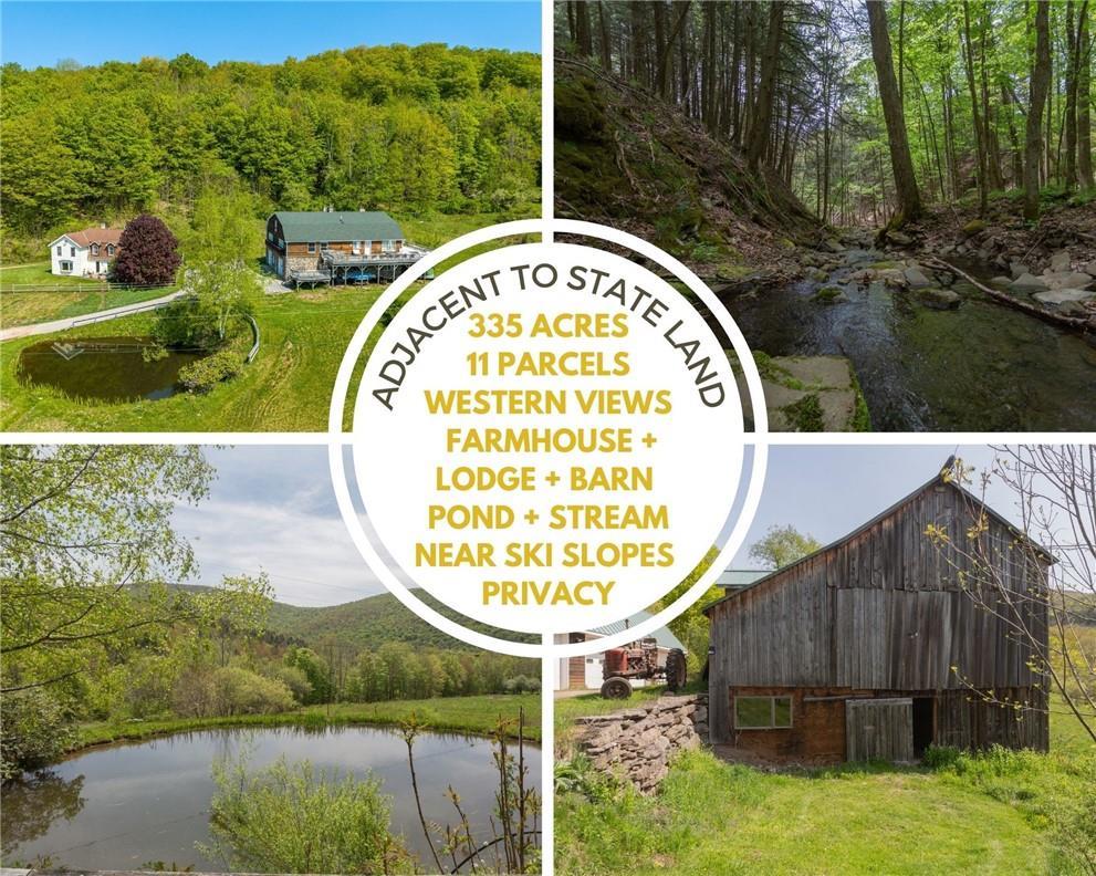 Own Paradise. At the end of a town-maintained dead-end road in the Catskills is The Odell Farm, 335 splendid acres of forest, meadows, pond, and stream adjoining thousands of acres of protected state land. This private and delightfully secluded retreat consists of the original 4BR 1.5 bath 1826 farmhouse and 1991 3BR 2BA oversized lodge along with a detached 5 bay garage and a professionally restored barn. Maintained forest roads throughout the property make for usable land to explore + the potential for new builds with spectacular western views. The farmhouse is replete with country charm. The Lodge, a mountain chalet impressive in size, is built like a fort. Experience unparalleled privacy within close proximity to Margaretville, Belleayre for Skiing, all 2.5 Hours to NYC. A unique opportunity to become the next steward of an exceptional property. includes 11 parcels: 11.1-1-1; 11.-1-3; 11.-1-4; 3.3-3-27; 3.3-3-37; 3.3-3-38.100; 3.3-3-38.200; 3.3-3-39; 3.3-3-40; 3.3-3-41; 3.3-3-42