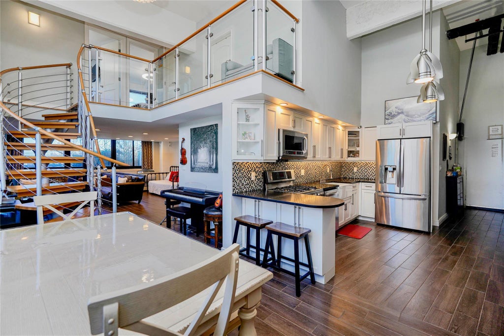 Walk in and take in soaring 14+’ ceilings and windows! A great duplex corner 2Br/1.5Bth home in 10 Bay St Landing! Beautifully appointed, the modern details in the kitchen and bath make this loft move ready. An imported German spiral staircase invites easy trips up to the bedrooms. The W/D room is also storage and can be an office. 1A is cocooned by trees on flr 1 and offers water views on flr 2. This is a must see. This Goldilocks home is generous yet efficient. The first floor is about 890 sq ft and the upper level adds about another ~400 sq ft.1A includes an assigned parking spot right outside your windows. Heat, hot water, gas and RE taxes are included in the maintenance. Located in the gated Bay Street Landing community, also included are amenities: package collection, 24hr security, tennis/pickle ball courts, BBQ's, great lawns, basketball, EV chargers and dog runs. Midtown and downtown ferries are 1/2 hour ride after an 8 minute waterfront walk. No subways necessary. If you're seeking quality of life, it's one of the best kept secrets in NYC, Call for a viewing today!