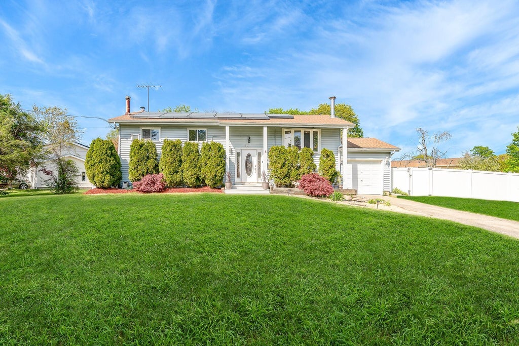 Welcome to this spacious Hi-Ranch in the Wheatley Heights community within Half Hollow Hills School District. This exceptional home offers 5 bedrooms and 2 full bathrooms, providing abundant space for both comfortable living and entertaining. Inside, you’ll find gleaming hardwood floors that bring warmth and character to every room. The kitchen boasts modern stainless-steel appliances, quartz countertops, and a convenient breakfast bar, making it perfect for casual dining. A formal dining room sets the stage for memorable gatherings, while the spacious living room creates an inviting atmosphere for relaxation. The home also features a large family room for casual get-togethers and a dedicated office space ideal for working or studying from home. Set on a generous 1/3-acre lot, this property offers ample outdoor space for recreation, entertaining, and enjoyment. The landscaped grounds balance privacy with an open, airy feel. Additional highlights include a 3-year-old roof with solar panels, adding energy efficiency and peace of mind. This Wheatley Heights Hi-Ranch is the perfect blend of comfort, space, and location. Don’t miss the opportunity to make this beautiful property your next home!