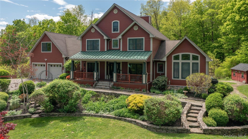 Tucked away on 20 peaceful acres in the scenic Town of Clinton, this distinctive contemporary retreat offers the rare combination of seclusion, style, and convenience. With the cachet of a Rhinebeck mailing address, inclusion in the Rhinebeck Central School District, and a location just minutes from Rhinebeck, Red Hook, and Millbrook, the property blends upscale country living with modern practicality. Perched on an elevated site across from Silver Lake, the home enjoys tranquil seasonal water views and a profound sense of privacy. Step inside to a wide, light-filled foyer that opens into the heart of the home—a dramatic living room with soaring vaulted ceilings, a striking floor-to-ceiling stone fireplace, and access to a generous rear deck overlooking the expansive, tree-framed backyard. Ideal for both entertaining and quiet moments, the main living area flows into a cozy den with French doors—perfect as a library, family room, or media space. The thoughtfully designed kitchen opens to a formal dining area, making dinner parties seamless. A nearby mudroom adds functionality with a half bath, laundry, storage, and direct access to the attached two-car garage. The main-level primary suite is a true sanctuary: spacious and serene, with dual walk-in closets and a spa-like en-suite bath that invites relaxation. Upstairs, two large bedrooms share a Jack-and-Jill bath, while an additional guest room or office has its own nearby full bath. A bright loft space, perfect for reading, working, or creative pursuits, overlooks the main living area and captures beautiful natural light through oversized windows. Rich hardwood floors and tasteful tilework add warmth and character throughout. On the finished lower level, you'll find an inviting media room, a wine cellar, a home gym complete with sauna, and another full bath—offering exceptional flexibility for daily living and entertaining alike. Beyond the main house, a matching oversized detached garage is a standout feature. With two deep bays accommodating up to four vehicles each—including one with car lifts—it’s ideal for collectors, hobbyists, or future creative use. Above, a fully finished studio or office with cushioned flooring and climate control (heat AND AC) via mini-splits offers endless potential. A side-covered bay provides room for outdoor projects or additional equipment storage. Both structures are clad in durable Hardie-board siding and backed by propane-fired standby generators for year-round comfort and reliability. Whether you're hosting weekend guests, pursuing passions in the studio, or simply enjoying a quiet evening on the deck, this property offers a rare opportunity to live expansively—with nature, luxury, and small-town charm in perfect balance.