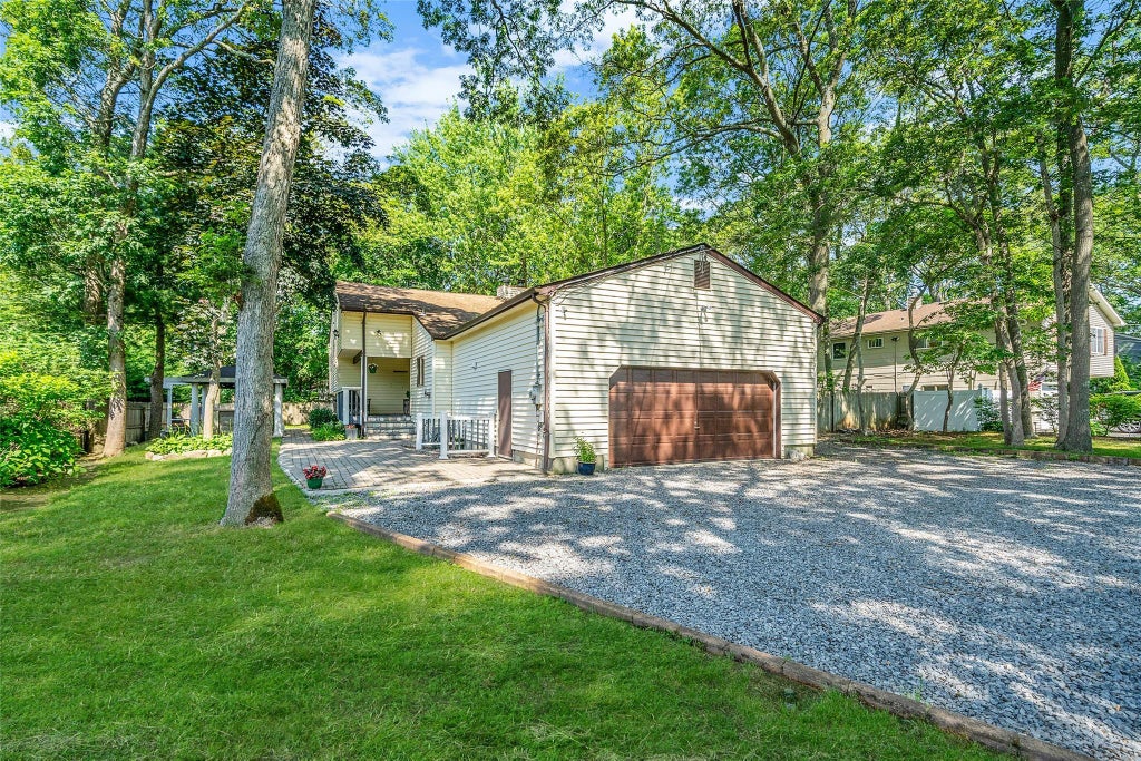 Welcome to 425 Puritan Drive, Shirley! This expansive five-level split was custom built with exceptional attention to detail and showcases true pride of ownership. Situated on a beautifully landscaped half-acre lot with partially wooded surroundings, the home offers park-like grounds and ultimate privacy. Enjoy peaceful mornings and relaxing evenings on the charming covered front porch or beneath the custom-built pergola. The main level features a welcoming foyer, spacious eat-in kitchen, formal dining room, and cozy living room with a fireplace. A half bath, laundry room, and direct access to the two-car garage complete this level—which also leads to the expansive circular driveway for added convenience and curb appeal. Upstairs, the second level boasts a luxurious primary suite complete with two walk-in closets, an additional closet, and a full ensuite bath. Two additional generously sized bedrooms and a full bath complete this floor. Continue to the upper level, which offers a versatile space perfect for a home office, den, or an additional bedroom—plus a huge walk-in closet. The lower level is ideal for extended living or an in-law suite, featuring a den, a fourth bedroom with a walk-in closet, a third full bath, and a summer kitchen. The basement provides abundant storage, a utility room, and space for a home gym or even more storage solutions. Let’s top off the storage options with expansive attic spaces, offering even more room for your belongings. Recently refreshed with all-new carpeting, freshly painted interiors, and wood-look ceramic tile flooring, this incredible home is truly move-in ready. Don’t miss this rare opportunity—as this one won’t last!