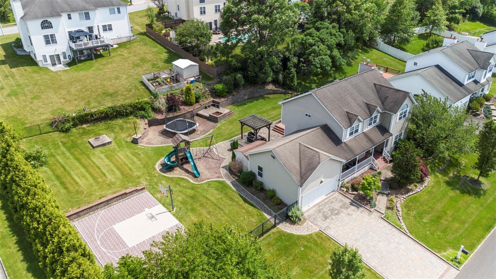 Welcome to 9 June Road, a rare gem offering 3,122 square feet of well-designed living space in the heart of the Village of Chester. From the moment you arrive, the curb appeal draws you in with a classic rocking chair front porch and custom pavers lining the driveway and walkways. Step into a grand open foyer with a formal living room to the right and an elegant dining room to the left, perfect for hosting special gatherings. Toward the rear of the home, the spacious kitchen with center island flows seamlessly into the cozy family room with a fireplace — ideal for everyday living and entertaining. Just beyond the sliding glass doors, a composite Trex deck invites you to experience the showstopper backyard, complete with a pergola for shaded relaxation, built-in firepit, children’s swing set, and a half basketball court — all surrounded by thoughtfully landscaped grounds that create a private retreat for the entire family. Upstairs, the primary suite offers a peaceful escape with a huge walk-in closet and a newly renovated bathroom featuring an oversized soaker tub. Three additional bedrooms and a full bathroom complete the second floor, providing plenty of space for everyone. The first-floor laundry room and half bath add convenience, while the large garage provides direct entry into the home. The finished 720-square-foot basement is a flexible space perfect for a media room, playroom, or home gym, and the pull-down attic offers even more storage. With solar panels, energy efficiency is already built in. As a bonus, an additional lot comes with the home, expanding your outdoor space to nearly half an acre for extra privacy and play. This is more than just a home — it's a lifestyle property in one of Chester’s most desirable neighborhoods. Don’t miss your chance to make it yours.