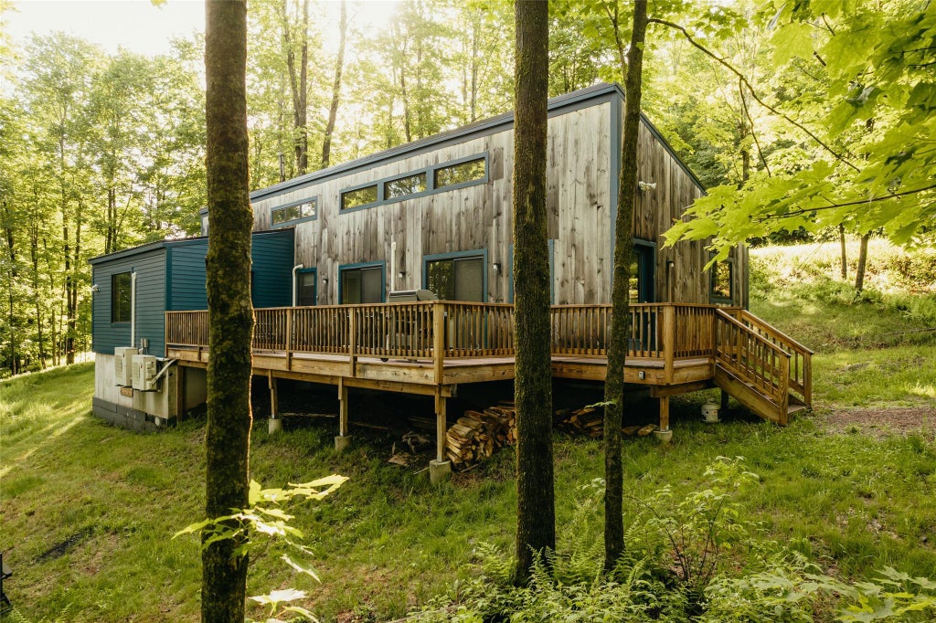 Nestled into a picturesque hillside between the sleepy hamlets of Youngsville and Jeffersonville NY, Blue Hill is a turnkey, peaceful getaway just two hours from NYC. Every room is thoughtfully designed to take advantage of natural light and beautiful surroundings. From the spacious, wraparound deck, you enter the home into the well-appointed kitchen, featuring shaker style-cabinets and open upper shelving. A white tile backsplash perfectly compliments the wood countertops. A convenient island makes an ideal coffee station or work from home space. In the main living space, vaulted ceilings and plenty of glass flood the space with light and keep the home feeling open and airy. Double sliding doors onto the deck frame out a lovely view of the surrounding forest and distant ridgeline. A wood stove brings the cozy factor and makes the space feel complete. Off the main hallway, you’ll first pass the convenient utility room with washer/dryer. Next is the first of two guest rooms. The vaulted ceiling keeps the space feeling open and inviting. A full bath features black hex tile floors and a white subway tile shower surround. The second bedroom features windows on two sides, making the most of the natural light and woodsy views. An L-turn off the main hallway leads past double hall closets to the primary suite. Among the many highlights here are the large picture window, generous en suite bath with walk-in shower plus a soaking tub with a view, and a private entrance onto the spacious terrace. The terrace itself offers abundant space for outdoor dining, entertaining and relaxing throughout the year. Outside, the seven acres have been left mostly wild, with lots of mature trees and ferns creating a calming natural environment. There’s a great fire pit site too. If you can tear yourself away from this charming oasis, you’re fifteen minutes or less from some of our very favorite Catskills Main Streets in Livingston Manor, Jeffersonville and Callicoon!