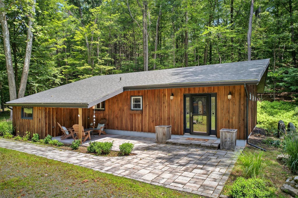 Restful slumbers, lazy days astride a babbling brook and sharing laughs with friends and family around a campfire on your patio: all this and more could be yours at 4260 State Route 17B, a private retreat on 1.32 acres surrounded by a low ridge of wooded hills and facing Joe Brook, a year-round brook in fabulous Callicoon NY, Sullivan County's town for fun, food and frolic. 4260 State Route 17B embodies the Catskills lifestyle with its bucolic setting, but just minutes to the towns of Callicoon and Narrowsburg where you can enjoy taverns, shopping, restaurants, a bakery and coffee houses. Set far back from the road and at a perfect angle to enjoy the view of a vast yard and Joe Brook, this one-story, fully renovated and meticulously maintained Mid-Century modern home is chock full of features that every homeowner desires: enter the house from a charming flagstone patio into the foyer of the great room with its high, beamed ceilings, clerestory windows and gas fireplace and you will feel immediately at peace. With dedicated space for both a large dining area and living room, the great room opens onto a gorgeous windowed kitchen with granite countertops, full size stainless steel appliances (dishwasher, range, microwave and refrigerator with ice maker) and more cabinets than you may have use for. With its dining bar and wide open plan design, you will find entertaining both joyful and effortless. Two king size bedrooms with ample finished closets lie off the main hallway along with a huge shared bathroom that has been tastefully renovated in gray and black (with double sinks in the massive vanity) and includes a laundry closet behind a barn door with washer/dryer hookups and room for storage, hampers and folding. The primary bedroom is also extra large and its en-suite bathroom also has a double vanity, modern stall shower of floor to ceiling glass and a jumbo walk in closet. Storage abounds in this mini-compound framed by mature trees including a large attached shed off the front patio for bikes and storage and another freestanding shed on the wide flat lawn. Professional landscaping surrounds the home enveloping it with the scent of wildflowers and evergreens. The back end of the property has a second flagstone patio with a firepit enveloped by the breeze through the trees, the jingling of the brook and your peaceful serenity. Plenty of parking is available in a porte-a-cochere style entry in front of the house and with a home as big as 4260 State Route 17B, you will surely have plenty of visitors.