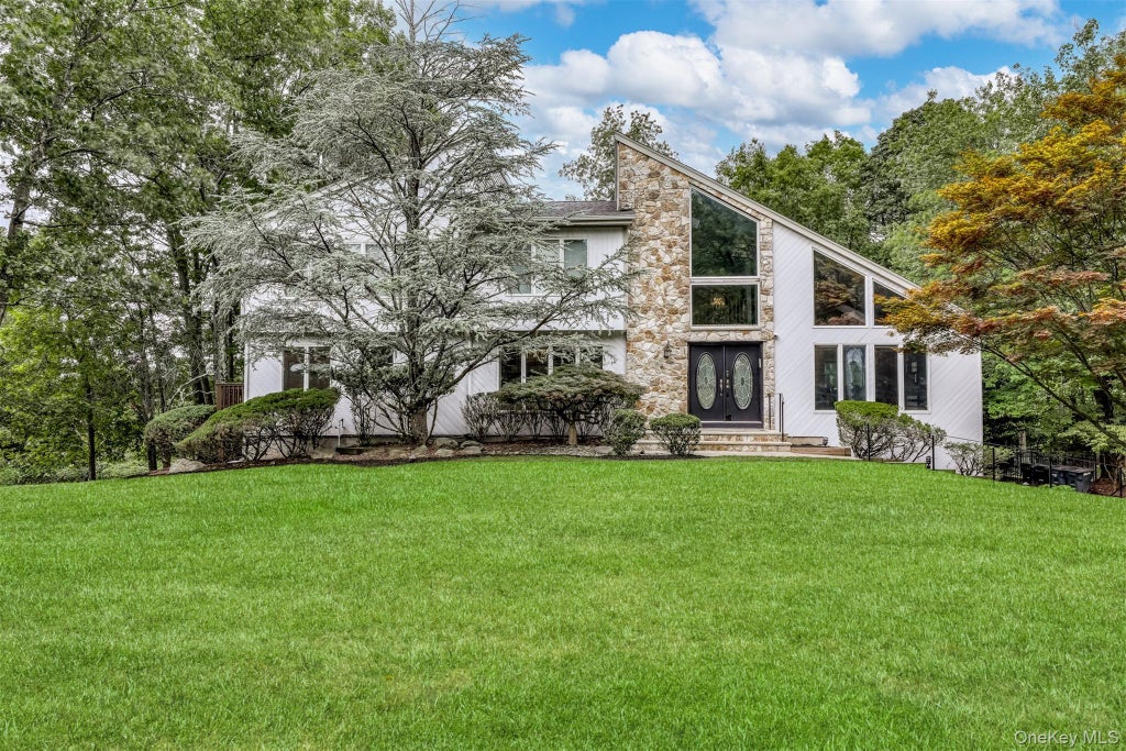 Step into this stunning Contemporary Colonial where elegance and space blend seamlessly. A grand entryway with soaring ceilings sets the tone for the bright, expansive layout that follows. The sun-drenched living room features oversized windows, skylights, and a dramatic floor-to-ceiling stone fireplace, creating a warm and inviting atmosphere. The kitchen, outfitted with granite countertops and a sub-zero fridge/freezer opens into a formal dining room adorned with a built-in marble table perfect for hosting. Just off the dining room, a second spacious family room with a marble fireplace and sliding doors leads to an oversized deck. A versatile first-floor bedroom with its own private entrance is ideal for guests or extended family. Upstairs, the second level offers four generously sized bedrooms with skylights, including a luxurious primary suite featuring vaulted ceilings, a walk-in closet, and a spa-like bath with a jacuzzi tub and walk-in shower. The fully finished basement offers incredible bonus space with a large family room, built-in bar, office area, and three additional rooms for flexible use. Step outside to your private backyard oasis complete with an expansive Trex deck and a gas heated inground pool, featuring a brand-new liner, perfect for entertaining or relaxing all season long. There are 360 degree outdoor high resolution cameras that record and split A/C units in the house.