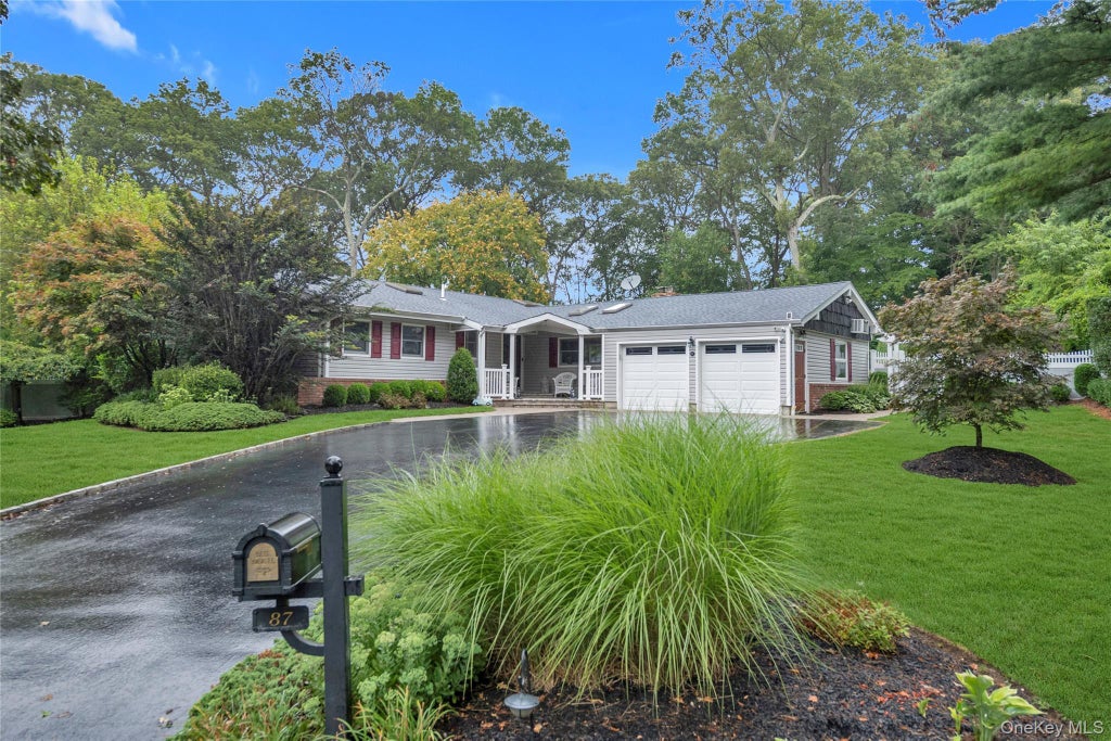 Sprawling, Renovated Pt. of Woods "L" Ranch on 1 private level, fenced and beautiful parklike professionally landscaped acre. One story living with open floor plan includes center hall entrance foyer leading to a spacious formal living room with large bow window, formal dining room with sliders to rear patio, vaulted granite eat- in kitchen with palladium window and stainless gas stove & a cozy den with vaulted ceiling, gas fireplace and skylites. 3 nice sized bedrooms includes an en suite primary bedroom with updated bath and guest hall bath. Additional features to this move-in condition home include all hardwood floors, 3 zone heating, central air, ig sprinklers, oversized 2 car garage with heat and air and side access door, covered front sitting porch, full finished basement with additional bedroom, bath, cedar closet, entertainment area, large laundry room and wet bar. More features include a semi-ig heated salt water pool, double paver patio, hot tub, outdoor grilling station with lights, waterfall, alarm, exterior lighting and speakers, generator hookup, updated roof (2014), siding, driveway and Andersen windows plus a stunning fully fenced rear yard and newly paved wide roads with extra guest parking. This home is move-in condition in Pt. of Woods Estates and conveniently located to Northern Parkway, Walt Whitman Shops, St. Anthonys High School and a new Whole Foods Market plus 10 min to vibrant Huntington Village with fine dining, theatre and shopping all in the award winning S. Huntington Sd.