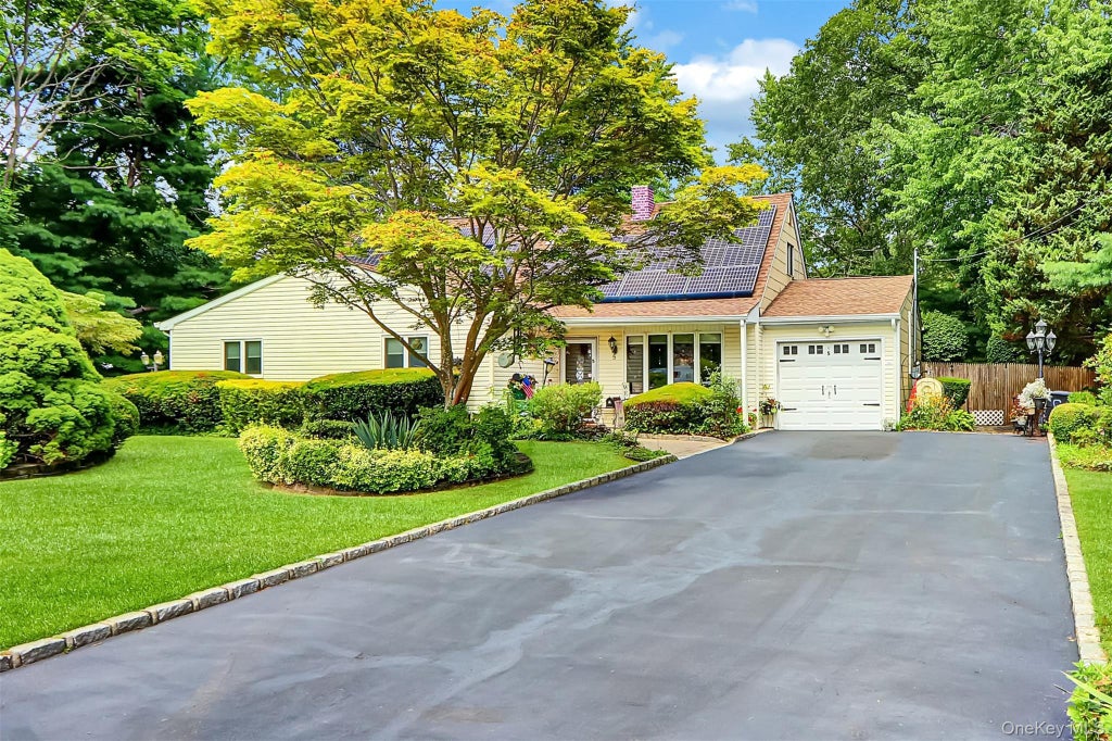 Welcome to this beautifully maintained 4-bedroom expanded ranch offering the perfect blend of comfort, function, and future potential. Step inside to find an updated eat-in kitchen featuring sleek stainless-steel appliances, tall cabinetry for exceptional storage, and gorgeous granite countertops. The spacious layout flows seamlessly into a large open living room and a bonus space that can serve as a formal dining room or cozy den—ideal for entertaining or everyday living. The primary bedroom includes a convenient half bath, 3 additional bedroom with ample closet space, and an updated hall bathroom with walk-in shower and sliding glass doors. A walk-up attic offers incredible potential for converting into additional living space, an office, or a den. Ductless air conditioning system. Outside, enjoy a fenced, landscaped yard with a private patio, perfect for relaxing or gatherings. One car garage with laundry. Recent updates add even more value, including a newer roof (6 years), energy-efficient leased solar panels (just 2 years old), updated 200-amp electric service. Comsewogue school district. This home combines style, functionality, and efficiency—ready for you to move in and make it your own.