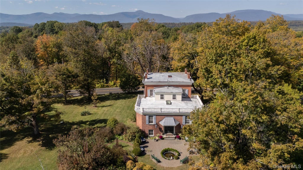 Welcome to 1281 Woods Road, a distinguished Germantown estate offering a rare opportunity to own a true piece of Hudson Valley history. Just half a mile from the heart of the village, this stately 1850 transitional Greek Revival/Italianate brick residence combines timeless architectural character with modern luxury. Set on over seven acres along one of Germantown’s most desirable roads, the property is surrounded by manicured English gardens, perennial flower beds, and mature trees, with rolling meadows, a clematis-draped gazebo, and wooded trails that create a private, park-like setting ideal for entertaining or quiet reflection. The 4,320-square-foot main residence has been thoughtfully renovated across three levels, with the expansive chef’s kitchen serving as the heart of the home, featuring Wolf and Sub-Zero appliances, sleek composite stone countertops, and a casual dining area perfect for gatherings. The elegant double parlor with twin marble fireplaces provides a warm and inviting space for entertaining, while the formal living and dining rooms showcase the home’s historic grace. Additional highlights include a cozy library or home office, a luxurious primary suite with a beautifully appointed bathroom, four spacious guest bedrooms, three additional tiled baths, and a convenient powder room. The finished lower level features a bright, windowed media room with its own bath, ideal for movie nights or a recreation area. Beyond the main residence, the property includes a beautifully restored historic schoolhouse—perfect for use as a creative studio, writer’s cottage, or private office—along with a large barn offering ample storage or potential for a workshop, gallery, or event space. Ideally located between Hudson and Rhinebeck and just over two hours from New York City, this remarkable Germantown estate offers the perfect balance of privacy, natural beauty, and proximity to local amenities, including Bard College, wineries, historic sites, and vibrant farmers markets—a timeless Hudson Valley retreat ready to begin its next chapter.